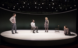 This is not, however (if you'll pardon the pun), a mindless experience. Because the four actors (Geneva Carr, Charlie Cox, Heather Lind, and Morgan Spector) play some two dozen characters across several decades of time on a nondescript, disk-shaped playing area (designed by Scott Pask and lighted by Ben Stanton) with barely so much as a shift of Catherine Zuber's costumes, things move quickly, and much of the onus for keeping up with it all is on you. It's not in any way difficult (everyone is at too high a level for that), but some commitment on your part is involved to refashion the individual colliding neurons within this gray-matter production into a cohesive and coherent story. At the outset, that's not so clear. You're introduced to a flurry of characters who all appear to be at cross-purposes (if not cross-identities) in communicating what the heck is going on. A woman named Evelyn bound up by perplexing questions of paternity, confronted by a man named Michael who promises information on her father she couldn't possibly have. Henry, who is capable of remembering nothing, trying to conduct the basics of life and human interaction despite needing to restart from nearly scratch every 45 seconds or so. Two dating women who meet online and hit it off, but are doing so on less an honest foundation than they initially believe. Last, but by no means least, a doctor who is so captivated by the prospect of being able to investigate Einstein's brain that, upon his death, he steals it right from his head.