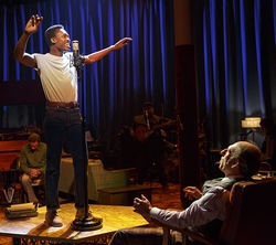 "My new songs rise to the beat / of bus boycotters' feet / Wanna take the struggle to church / And drag gospel into the street," Marty says. Joe's view: "What you writin' is a gospel version of the plague." And his perspective is understandable, given that it immediately follows a cut of a song whose refrain turns on the phrase "That's why he's Jesus and you're not, Whitey." Shockingly, their act breaks up, and Marty starts his own with his friends to sing the kind of music he's positive will influence the kind of change he's desperate to see, in a time and place he thinks craves it. He falls in with a white, English producer, Byron Blackwell (David Cale), Marty believes can realize his vision even if he doesn't entirely share it. And although that influence does indeed propel Marty and his debut album (which shares the show's title), it comes at the expected steep cost that forces Marty and Joe to consider whether they're really better apart than together. It wouldn't matter that there's nothing new hereeven within the Stew-Rodewald theatrical oeuvreif the musical storytelling were fresh and vibrant. But Stew, who's credited with the "text," has taken far fewer chances this time around. There are only three characters of note (a few others orbit Marty at various points, but contribute little of consequence), and their goals within this framework are too small to fill out even the modest 100-minute (intermissionless) running time. And after the conflict is established, there's nowhere unexpected for it to go or grow, and a cursory knowledge of recent American and musical history is enough to know how all this is likely to end up. The action also never strays far from the look and atmosphere Andrew Lieberman's homey recording studio set, including following a major change before the final scene. This is a musical that's content to live in a safe insular world, a philosophy that manifests itself in the costumes (Gabriel Berry), lights (Thom Weaver), and choreography (David Neumann) at least as much as in the score. Individual numbers toe the line between the warring genres, but fit comfortably in neither, and make a minimal impact on anything that surrounds them. Here, no number stands outand not in a good way. Though, to be fair, not in a bad way, either: Most of them seem indifferent to the concept of singing, let alone communicating, altogether. Director Joanna Settle has staged the material sufficiently, and coaxed professional if damp performances out of the actors. Hall and Blankson-Wood generate a fair amount of heat during the opening scene, but can't keep those fires burning all the way through. Too often you sense that they, like Stew and Rodewald, are trying to let the writing carry more weight than it legitimately can; this is exactly the kind of show that needs of a galvanizing star performance to tie everything together. As it is, you get that only in limited quantities. Stew, who plays in Marty Beller's onstage band, serves up a bit of sparkle when he speaks and sings as the closest thing there is a tangible onstage conscience. Take, for example, his reaction to this makeshift lyric of Marty's: "You could take a phrase like 'floor wax' / And then repeat it til you get into a trance / Cuz this trance ain't about religion. / It's more a kind of self-hypnosis." Stew, his character ever the realist, retorts, "That lyric will never make it to Broadway, never!" He's right, but not because of any given line: The Total Bent, unlike its more adventurous, electrifying predecessor, doesn't seem to belong thereor much of anywhere else.