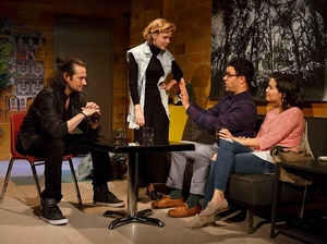 Perhaps the play itself, which has been directed by Portia Krieger, would be more convincingand more entertainingif it weren't its own kind of echo chamber. But Alvarez seems determined, intentionally or otherwise, to prove her thesis correct by crafting a lean evening (a mere 80 minutes) that's all about pretending to say something while in fact it's not saying anything. If it's supposed to be meta, demonstrating by example precisely what it's arguing against, then mission accomplished. But that doesn't mean it's fulfilling. Rather, it's dry, frequently tripping up in the banality of its own self-deluded adventurousness. The most pivotal character is Lil (Anabelle LeMieux), a performance artist whose entire stage oeuvre falls into the titular category. When we first meet her, she's cataloging her notions of fear by way of a flashlight and a spinning cantaloupe; later, a snake, first rigid and soon floppy, figures prominently in her love life. (Subtlety is not the order of the day here.) Two of her closest friendsKevin (Aaron Costa Ganis) and his fiancée Molly (Zoe Chao)aren't sure what to say to her; her ex-boyfriend and current-something Nate (Constantine Maroulis), who's also Kevin's oldest friend, seems more genuinely supportive. Still, no one argues with the proposition that Lil isn't going anywhere. Neither is anyone else, really. Kevin, a corporate art curator, has given up hope of finding a job he loves, and is about ready to move with Molly to Virginia so he can attend law school. Molly's found some pleasure in office-job life after bombing as an actress, but still carries a sputtering torch for that life. And Nate, a teenage one-hit-wonder rocker in the 1990s, is now living off his past fortune and glories, unable to recapture his brief moment in the spotlight beyond showing up to make his unhip friends appear more cool. In other words, no one is content, so when Molly and Nate discover they're kindred spirits, and Kevin finds in Lil's wayward act an outlet for his own managerial ambitions, it looks as though sparks are about to fly and the temperature about to shoot through the ceiling. That's not quite how things roll here, however. Alvarez spends the remainder of her playliterally, until the very last line of the very last scenewriting around these relationships, as if to always make you think they're unwinding in ways she has no intention of letting them. Misunderstandings are rife, but fizzle out within moments of flaring up; no one ever does anything wrong, and no one is interested in pursuing misconceptions to their natural conclusions, so even when things occur, nothing actually happens. By the third or fourth scene packed with sexual innuendo that ends with a character offended at the notion another would consider sleeping with him or her, you start to feel manipulatedand not in a good way. This uncertainty is part of Alvarez's point, playing on the second meaning of the title: Maintaining friendships on the proper term is its own kind of bewitching juggling act. True. But because Alvarez doesn't delve into the complexities and explore the nature of all the connections we're supposed to accept (both the romantic pairings feel off, and it's never clear why rock-sex-god-in-decline Nate has any affinity at all for the hopelessly square Kevin), everything zips by in a fuzzy, unaffecting blur. Krieger's staging, on a handsome, comfy bi-level loft set by Daniel Zimmerman, is well paced but muted, as though it too is finding these people's attitudes toward each other confusing. The actors, too, plod through their scenes with vague, deer-in-the-headlights expressions that suggest they can't make a lot of sense of it, either; only Maroulis, a former American Idol headliner, seems a tight fit and as though he's halfway enjoying himself. Still, he's expected to make a flirter and cheater likable without more to work with than a post-yoga ice-cream scene and some fractured advice to the women about the price of fame. Maybe Nate's a human being, but, like everyone else here, he hasn't been written like one who has the courage of any convictionsor, for that matter, as much as mild indifference. That's part of the problem with loading a play with characters who have been so burned by their own failures: They're not a lot of fun to watch and, in the end, not fit to be around anyone but each other. That explains why, for each of them, friend art is more or less the only kind of art there is, but it doesn't make for a good reason to see Friend Art when so many other options are available that find much more worth in looking outward than inward.