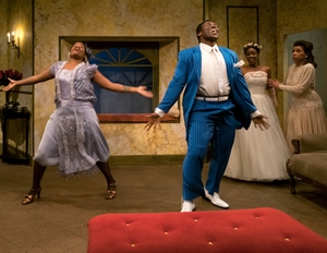 The play takes place in "Strivers Row," an actual area of well-appointed townhouses along 138th and 139th Streets between Seventh and Eighth Avenues. In one of these live Oscar and Dolly Van Striven and their daughter Cobina, a student at Radcliffe. As the play opens, preparations are being made for an elegant party to mark Cobina's debut in black society. Amidst the bustling of dusting and arranging of furniture, there is a light tone, marked by a great deal of bantering between Dolly (Kim Yancey-Moore) and her brassy maid Sophie (DeAnna Supplee), so much so that you may think you've entered into the kind of world depicted in a sit-com that would appear three decades later, about the nouveau riche couple "The Jeffersons." But it isn't long before you realize something else is going on, as Dolly grows increasingly nervous. She keeps looking out the window to see if the guests are starting to arrive, but only a few have shown up. One of these is her "frenemy" Tillie (Lauren Marissa Smith), who is there to cover the event for the "Black Dispatch," a newspaper that specializes in dishing the dirt about the goings-on in black high society. Unfortunately, it appears there will not be much of an event, given the low turnout. Here the playwright begins his juggling act of styles as he introduces the other characters. These include Hennypest (Lawrence Winslow) a windbag academic; Lily (Christina D. Eskridge), an actress who will start emoting at the drop of a hat; and the Davises, Louise (Marlaina Powell) and her philandering husband, Dr. Leon Davis (Roland Lane). They flit in and out of the front parlor where the play takes place, joined from time to time by the young and snooty Ed Tucker (Adrian Baidoo), whom Dolly has tagged as the perfect beau for her daughter; and Tillie's niece Rowena (Ruby Thomas) a "rival" for Ed's attentions. Meanwhile, Cobina has her own ideas of who the perfect beau is; her heart is set on a working class young man, Chuck (Anthony T. Goss), who has arranged to join the serving staff in order to be close to Cobina. (Expect a confrontation or two before too long.) As you might imagine, there is a lot going on. Yet the big surprise has yet to come. It seems that Oscar Van Striven has invited an additional guest, Ruby Jackson (Linda Kuriloff), a former cook who recently won a large sweepstakes prize. Oscar, who confesses that he is edging close to bankruptcy despite appearances, is working on a deal to sell Ruby a piece of property that will save them all from financial ruin. For her part, Ruby is eager for an introduction into society, and she is counting on the Van Strivens to be her sponsors. Dolly Van Striven and her icily proper mother, Mrs. Pace (Marie Louise Guinier), are aghast, but this is nothing in comparison to their reaction to a pair of party crashers who have come with Ruby. Suddenly, we are faced with a real aberration, the wild zoot-suited Joe (a firecracker performance by SJ Hannah) and his exuberant companion Beulah (Madelynn Poulson). They represent the living embodiment of Dolly and Mrs. Pace's worst nightmare, the "lowlife" of Harlem they have so carefully walled themselves away from. The pair make themselves at home, dance up a storm (the director also choreographs), and generally blow up the party, much to the delight of the gossipmonger Tillie. ("What a headline," she cackles. "Pimp and Pal Wreck Society Gal.") Ultimately, we learn that the Van Strivens have been set up all along, as Tillie has been aiming to bring them crashing down in a great show of public shaming. It is she who has invited Joe and Beulah to put on a show, and who has disinvited most of the upper class guests. Yet, thanks to a little blackmail, all is eventually set right. And before the evening has ended, Dolly and Mrs. Pace will have learned some valuable lessons in humility and generosity of heart that soften them up. Altogether, On Strivers Row is like some crazy mixed-up combination of Hellzapoppin, You Can't Take It With You, and those old melodramas about dastardly villains. It is often quite funny, yet it carries an undercurrent of racial stereotyping that makes you unsure as to whether to laugh or to cringe. Sample dialog: "You shuffle like Uncle Tom after he has swallowed ten beers." "You're still just another face in the Harlem coalbin." "You will see some fine young men here tonight. Unfortunately, one or two have kinky hair." Despite any qualms you might have about lines like these that are casually tossed about throughout the play, On Strivers Row is a remarkable piece of the crazy quilt that is American theater. It is being given a first-rate production, with a well-designed set by Collin Trevor Eastwood, sumptuous costumes by Sidney Fortner, and strong performances by the entire cast. With this season's productions of On Strivers Row and the equally excellent Leah, the Foresaken, the Metropolitan Playhouse is showing a real boldness in presenting complicated and gutsy works from the past, evoking racial stereotyping in the former and anti-Semitism in the latter. These are not easy to pull off, and so kudos to all involved!