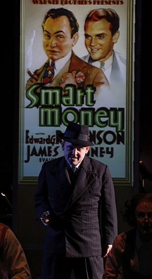 Despite this, Cagney never emerges as a complete, interesting person the way, say, Fanny Brice does in Funny Girl or Gypsy Rose Lee does in Gypsy. The details of who Cagney is as a man, behind his professional persona, simply don't seem to interest the authors much. We briefly meet Cagney's wife (Ellen Zolezzi) and mother (an excellent Danette Holden), for example, but they're barely supporting characters, and don't inform him in any way beyond gentle support. And though Warner is presented as the major influence in Cagney's life, he's presented as a flat, dullish dictator type who doesn't actually possess much imagination of his own. This is also responsible for one main sense of confusion: competing frames for the story. Though Warner introduces the show with the song "Black and White," in which he takes credit for making Al Jolson, Errol Flynn, Greta Garbo, and Bette Davis, there are also scenes set in the then-future (1978), when Warner and Cagney bicker while waiting backstage before a SAG Lifetime Achievement Award ceremony. It's clear that the writers grasp the importance of the Cagney-Warner relationship, but they haven't yet figured out exactly what it means for their show. Determining that would help a lot. The evening is otherwise hackneyed and directionless, drawing what little zest it does from depicting broader personalities like Bob Hope, who shows up (played by Jeremy Benton) to offer his usually coercive badinage, and even Mae Clarke, who got a grapefruit in the face from Cagney in The Public Enemy. As for the score, it's barely evanescently pleasant stuff, but so substance-free (representative song titles include "Crazy 'Bout You," "Falling in Love," "A Work of Genius," and "How Will I Be Remembered?"), that not even Matt Perri's spirited five-piece band can make them come to life. (James Morgan's sets, Amy Clark's costumes, Brian Nason's lights, and Mark Pirolo's projections make similarly effective, if inadequate, contributions.) Though most of the cast is accomplished if unexceptional, Creighton works tirelessly to energize Cagney. A fine singer and an even better dancer (in both cases, superior to the real Cagney), he floats effortlessly through the musical numbers. Otherwise, his characterization is limited to an Irish lilt muted by unchecked ambition; he doesn't reveal many complexities or trade in much must-watch magnetism, making this less than the absolute star performance the show would need to overcome its writing. Only in one sequence do the individual elements suggest the potential of greatness. It's during the filming of White Heat, when Cagney, determined as usual, is working as much as he can within the bounds of the script to make his run-of-the-mill tough a multifaceted victim of circumstance. Through id-driven creativity, he transforms each scene into one of barely controlled chaos, with his character, Cody Jarrett, the only constant of stability. Seeing the impact one man makes on an entire art form is what the show seems to want to be about: how it's possible to subvert expectations to make something memorable out of something apparently pedestrian. This would suggest that there's no reason that tactic's two main proponents here, Cagney and Cohan, couldn't work together. As things presently stand, the latter is drastically upstaging the former.