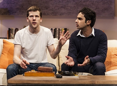 Given that Ben is the most compelling figure in, and the white-hot center of, Jesse Eisenberg's biting but too-chewy new play at the Pershing Square Signature Center, it's hardly surprising that Eisenberg has reserved just that role in Scott Elliott's production for The New Group. Eisenberg may still be best known for his Hollywood work (foremost his turn as Mark Zuckerberg in The Social Network), but he's made something of a second name for himself playing these sorts of wayward lingering-adolescents in his own Off-Broadway plays (Asuncion, The Revisionist) about clashing worlds that can't entirely pierce self-satisfied bubbles of disaffected ennui. The sheer gusto with which Eisenberg has written and plays Ben brands the young man as Eisenberg's most vivid character to date. Someone who starts off looking like a jerk-for-jerk's-sake is slowly but totally revealed as someone who's masking an immense amount of pain behind his violent façade. (Rest assured, this isn't spoiling much, as the seeds for this are planted not long into the two-act play's first scene.) What you can't understand until you've seen the whole thing, however, is the depth of Ben's agony and its associated depravity, qualities that Eisenberg highlights on both the page and the stage with a gripping indifference that makes bloodily clear how far gone he already is and why stepping back from the edge is probably almost impossible.