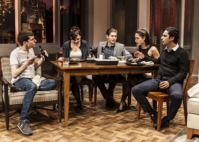 His own problem, earlier that day meeting an elementary school friend named Ted who's now a successful banker and about to marry the girl Ben's always had a crush on, must necessarily take precedence. So when he reconnects later with Ted (Michael Zegen), it doesn't take long for what at first appears to be an ordinary extension of his brashness to become darker and scarier. He tramples on Kalyan by claiming as his own Kalyan's idea for an independent documentary Ben should make. He begins breaking down and reorganizing Ted's relationship with his fiancée, Sarah (Erin Darke), so that by the time we finally meet her, Ted is on the emotional defensive, with his every word scrutinized and his every action looking like desperate attempts to stay relevant after another power player has entered the room. By the time all five of them gather for dinner (a non-traditional "traditional" Nepalese spread, prepared by Kalyan), Ben's basic plans are well underway and then he gets really nasty, with each new tactic surpassing most of those that came before. Acts such as twisting the others' selfless stories into models of selfishness and shaming Ted at every turn (he even claims the two of them, at Ted's instigation, killed one of their classmates) become like declaring open warfare. The full, wide-ranging scope of its devastation not fully visible until Act II, when Ben finally tries to claim for himself the one thing he wants most, but there's a fearlessness to his approach that precisely defines Ben and energizes The Spoils just when it needs it most. Things are more sluggish elsewhere. Eisenberg hints at broader themes, particularly of race, that never jell into the significance you crave for something to. Worse, none of the other characters is remotely as interesting as Ben. Though Nayyar (TV's The Big Bang Theory) invests Kalyan with a cuddly likability that nicely calcifies under Ben's attacks, he seems more one-dimensional and less brilliant than the script indicates he should. Aside from her snippy quips with Ben and a harrowing physical exchange with him near the end, Reshma is thinly sketched and sounds at most one braying note; Sriram plays it well, but it gets a bit tiresome. Sarah is an attractive prospect for Ben and Ted alike because she needs to be, but neither Eisenberg nor Darke, the latter doing her sympathetic best, lets us see why. Only Zegen (Bad Jews) creates a complete personality, though the nervously eager-to-please frat boy he's carved doesn't leave him anywhere to go. Though the physical production is just right, Elliott's work is marred somewhat by dead patches in the pacing; a tighter, more relentless feel throughout would up the urgency and better propel us into the brutal final scene. Though Eisenberg does not end it gracefullyhe barely ends it at all, in factit's a juicy culmination of most what's come before, yanking us about as far as we can go into the shadowy reaches of Ben's unsettling mind. The centerpiece of the scene, in which Ben describes to Sarah a dream he had about her some 20 years earlier, is an eerie marvel of scatological storytelling that could well go down as a poetic, if stomach-turning, highlight in Eisenberg's dramatic-writing career. It's unquestionably disgusting in its particulars (which won't even be acknowledged here), but there's also something sweetly romantic, even endearing, about it, as though the essential innocence it suggests is just as much a part of Ben's psyche as his warped-mind capacity to disturb. Eisenberg is showing us every angle of this man, even (especially?) those we might otherwise demand not to see. The rest of The Spoils may not live up to this audacity, but his daring to show us Ben at his most naked and most helpless lets us view from a terrifyingly close vantage point the dangers of living too much in your own id rather than the less predictable and less satisfying, but far more dangerous, world of the others we depend on to keep us from becoming our own worst selves.