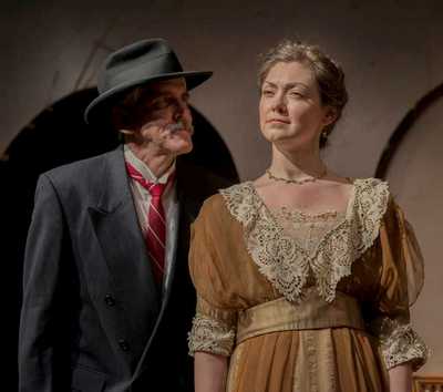 While it certainly is true that Within the Law is a melodrama, the writing is sharp and often very clever, and the cast, under Michael Hardart's steady direction, stays focused on the play's prevailing theme while assiduously steering clear of the kinds of emotional excess associated with the genre. The central character is Mary Turner (an excellent Elisabeth Preston), a smart and confident young woman who is working as a sales person at The Emporium, owned and operated by Edward Gilder (John D. McNally). Despite a stellar reputation and a spotless record, Mary has been accused of theft from the store, and has been summarily tried and convicted on circumstantial evidence, abetted by Mr. Gilder's insistence that she be made an example of, and, as she says, the fact that her court-appointed counsel was a "boy trying his first case." When Mary emerges from prison after serving three years, she has learned a lot about how men like Mr. Gilder manage to stay at the top of the heap by hiring cadres of corporate lawyers who know how to operate just within the law. As Gilder himself puts it: "I'm not a swindler; I'm a financier." It isn't long before Mary has set herself up in business with a group of grifters, whom she trains to find legal avenues for their con artist schemes. Although she has been managing quite well, Mary sets her sights on avenging herself against her former employer. Will she succeed, or will she overstep her bounds? And what will happen when Police Inspector Burke (David Logan Rankin) makes it his life's work to pull the plug on her little enterprise and bounce her back to prison? (I did tell you this was a melodrama.) For much of the rest of the play, the audience is treated to a tennis match between two pros, as the ball volleys back and forth between Mary and Inspector Burke. There is only one unexpected (to Mary) complication, and that comes in the form of Mr. Gilder's son Dick (Ryan Reilly), who, for better or worse, has fallen in love with her. In the end, both justice and the law are served, if not the broader issues of equity that the play addresses. Throughout, the four leads do splendidly inhabiting their roles and bringing their somewhat stereotypic characters to life. They are well supported by the 10 other cast members, who double as scenery movers over the course of the play's four acts (running time, two-and-a-half hours with one intermission).