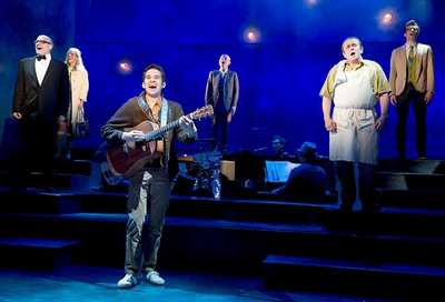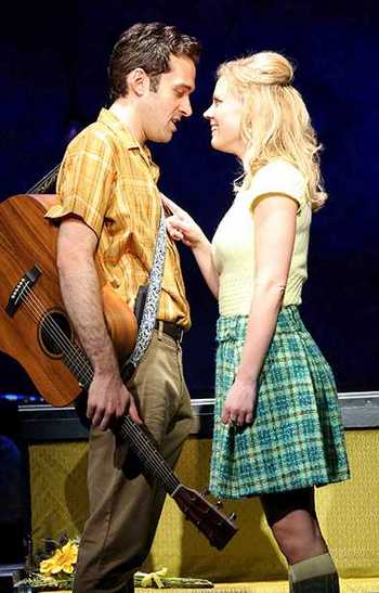 Not that either Harold (Chanler-Berat) or Daphne (Murin) would see it that way, of course. Harold is a young sandwich-maker by trade who adopts an avocation as a musician when he discovers his mother's guitar (which she never played) after her death. Daphne, on the other hand, is a talented singer-actress who moves to New York from Hill City, South Dakota, with her sister Miriam and discovers that making it big on Broadway isn't quite as easy as she thought. Foiled and failed aspirations of glory and achievement aren't what their joint story is about. That's a part of it, sure, and we witness Harold's attempts at songwriting when he can only play a single chord and a handful of Daphne's disastrous auditions before she lands a dream job in a play that's being written explicitly for her. What matters more is how they find each other and overcome the obstacles they face, which can be as mundane as Harold's irritable sandwich-shop boss, Crabble (Michael McCormick), or as Earth-shaking as Harold falling for Miriam (Allison Case), after she helps him take his ever-aborning song to the next level. Maybe these are ordinary people with pedestrian problems, but Chanler-Berat and Murin channel their personalities into their portrayals enough to make them noteworthy. The natural, aw-shucks shyness that served Chanler-Berat so well as the teenage boyfriend in Next to Normal is put to even better use here: It creates a shell around him that Harold's being in love can believably crack, and the excitement and ability that grow in Harold as time passes are palpable. And Murin slowly and subtly defuses Daphne's preternaturally sunny exterior to make her a woman who's more complicated and forward-thinking than when we meet her.