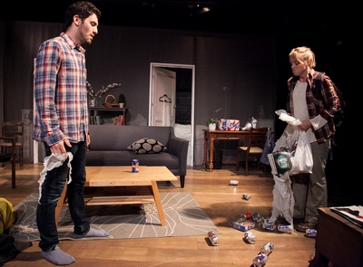 Temporarily homeless thanks to Hurricane Sandy, the 2012 superstorm that hit the region like a ton of bricks, Gordy (Dave Klasko) has landed on the doorstep of his ex-girlfriend, Mere (Jody Flader), in search of shelter until he can get back into his own East Village apartment. To be fair, and assuming he is being completely honest, Gordy is not expecting Mere to be the one who buzzes him in. It is actually her roommate Ally who has offered him a place to stay after he has been bouncing around from couch to couch and is running out of friends he can impose on. He is exhausted, disheveled, and weighted down with the burden of hauling around his stuff in a big backpack and trash bag. Ally is nowhere to be seen, and, indeed, never does show upbut here is Mere, as big as life and less than thrilled to see him after he bailed on her a year earlier. If you sense the set-up for a battle-of-the-sexes romantic comedy, you'd be partly correct. Certainly, there is plenty of characteristically biting banter and underlying sexual tension in Gordy and Mere's early scenes together, and you can tell they once were in a real relationship, even when they get into an argument over whether they need to go out to vote, this being Election Day. The playwright has a real gift for capturing the kind of hyperbolic dialog that characterizes such increasingly pointless arguments colored by elevating emotions, along the lines of "do you believe in the democratic process?" and "last time I checked the ConstitutionÂ…" This is funny stuff for us to observe from the safety of our theater seats. But Mere is not laughing, and recognizing she and Gordy are simply falling into their old habits, she becomes disgusted and decides to leave the apartment for the night. Gordy isn't alone for long, though. Someone enters through the window from the fire escape, an African American man that Gordy, who is white, takes to be a burglar. As it turns out, however, the intruder is an upstairs neighbor named Job (Ruffin Prentiss), who says he has befriended Ally and Mere, and who then proceeds to make himself at home. Job knows where the beer is hidden, and he persuades Gordy to join him in polishing off a couple of cases of brew. As the beers loosen their tongues, it seems Job knows a lot about how to push Gordy's buttons, and their time together represents a culmination of Gordy's own "perfect storm" of doubt and anxiousness that punched him in the gut with the arrival of the hurricane. There is camaraderie and confrontation galore, and some blood is shed on both sides. When Mere returns, she is confronted with a wrecked apartment and a wrecked ex-boyfriend. It's up to her to decide whether she will pick up the pieces of both. Despite a shaggy and occasionally meandering plot, Gordy Crashes, with a run time of 80 minutes, offers up sharp dialog that perfectly captures the insecurity and uncertainty that marks the lives of 20-somethings like Gordy, who has yet to find a replacement for the kind of intellectual argumentation that undoubtedly served him well as a late-adolescent college student. It is real life that eludes him now, and he must face the question that Job poses: "Why do you care so much about what other people think about you?" Under the direction of Sherri Eden Barber, Ms. Flader and Mr. Prentiss give excellent performances in roles that serve largely as foils to the central character, and Mr. Klasko truly shines as Gordy, capturing both his boyish charm and his flair for passive-aggression and self-destructiveness.