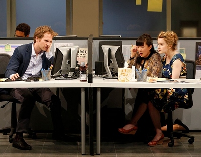 How can that be, you may be wonderingsurely something else must be going on. Well... yes. This should not shock anyone who's seen Jacobs-Jenkins's previous plays. In works like An Octoroon, Neighbors, and Appropriate, the young playwright has demonstrated a searing knack for extracting pinpoint drama from naked metaphor, even if the final execution is not all it should be. And though Jacobs-Jenkins is writing in a more conventional mode this time, the blooming of his ideas is no less alluring, and the final picture they paint of a small group in the midst of a big crisis of body, soul, and conscience is by far his strongest theatrical creation to date. The other part of this, sadly, is that to reveal the lynchpin occurrence that makes everything makes sense and makes this an early contender for the best play of the newborn theatre season would cause the towering house of surprises to collapse. Luckily, because Jacobs-Jenkins has structured his play so well, and filled it with such sumptuous, relatable characters, you don't need to know what makes it all tick. You simply need to trust that it will all come together, which it does, in taut, heartbreaking fashion. And, as mentioned, it all starts in an office. A Manhattan magazine office, to be exact (the playfully sterile set, which has a trick or two up its own sleeve, is by Takeshi Kata), in roughly the present. It's an ordinary place packed with ordinary employees, who haven't yet realized how extraordinary everyone outside the walls thinks they aren't. Dean (Ryan Spahn) is an editor's assistant on the cusp of 30 who's been at work here many years longer than he initially planned, and is shopping around a novel (titled Zine Dreams) about his experiences watching the decline of print publishing from the inside out. He gets along well with his cubicle neighbor, Ani (Catherine Combs), a relatively new employee who hasn't yet lost her lust for the business. He is rather less enamored of Kendra (Jennifer Kim), who comes in late, leaves early, and never writes. As for the still-in-school intern, Miles (Kyle Beltran), he's friendly and eager, but who knows anything else about him?