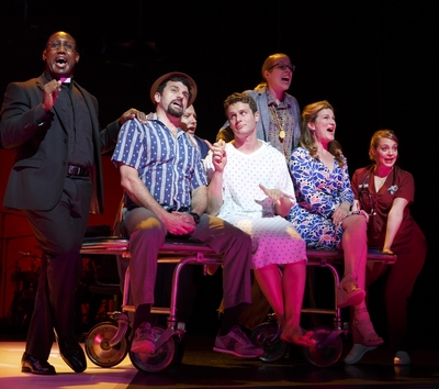 Each musical number (there are more than 30, crammed into a scant 100 minutes of playing time) broadens or deepens your understanding of who Gordon is and how he perceives his existence. This is most evident in more abstract songs like "Gordo's Law of Genetics" (riffing off a family medical history survey, with Mimi insisting everything bad comes from her departed husband's side of the blood line), "Sitting Becalmed in the Lee of Cuttyhunk" (something of an MRI-encased fever dream), and "In the Middle of the Room," as Gordon ponders the oddity of being the chief bystander of his maddening ordeal. And, certainly, such numbers are jagged and unusual, staccato shots (occasionally of sedative, occasionally of adrenaline) that highlight Gordon's increasing disconnection. "Sailing" (the show's enormous break-out cabaret hit), however, is perhaps even more powerful in its context as Gordon's hazy imagining of Roger's maritime-focused psyche. He projects plenty of his own fears onto the nice nurse sponge-bathing him (leaving an open question who's really the subject of the song's title, "Poor, Unsuccessful and Fat"), and Mimi when she arrives to try to fix things as only a mom can ("Mother's Gonna Make Things Fine"). And Mr. Bungee slowly evolves from an agent of persecution into the encouraging force keeping Gordon aware. Little here is exactly what it seems to be, and through bouncing tunes and lilting lyrics ("Veins in the brains are like balloons / Filled with water / Sometimes they burst / If comes to worst / Which unfortunately yours did"), Finn makes that captivatingly clear. Though tangible reality is essentially a character, and makes its presence keenly felt at certain points (most notably the duet "Just Go," when Roger tries to stay the night against Gordon's expressed desires), its application represents the shakiest sections of the show's otherwise rock-solid concept. The homeless lady gets two songs ("Change" alone and "A Really Lousy Day in the Universe," a duet with Roger) that have too tenuous a connection to Gordon to fit easily; and though Mimi's "The Music Still Plays On," as she tries to cope with her son's near-death while facing off against his personal library, is an emotional high point, it's narratively useless, documenting specific action outside of any possible frame of Gordon's reference. So, no, A New Brain is not perfect. Still, such flaws hardly matter when the presentation and the casting are as elegant as they are here. Groff brings a beguiling, ironic air to Gordon that illuminates his limited vision of the world, but gives the actor plenty of room to expand to more sprawling vistas of emotion later. The tight and neurotic attitude he adopts early on, which melts into an agonized acceptance later, is just right for a wunderkind facing his own mortality earlier than he ever expected. And Lazar cuts a tall, strong, and stolid figure that's a clean, compelling contrast. Everyone here is good, though, with the intense Louis, the mirthfully menacing Fogler, and the hilarious Lamon meriting special mention for their acting, and Dean and Darrington particularly notable for their drier comic senses and superb singing. Perhaps the best blend of talents, though, comes from Gasteyer, who aces Mimi's frantic comedy and pierces through the score with her arresting, clarion belt voice, but likewise has no trouble pulling back far enough to let you see the precise, intimate boundaries of her feelings for Gordon. This is a woman who's long had to make it on her own, but secretly knows she could not have done it without help. That sounds more than a little like Gordon's lesson, no? Such parallels are rife throughout A New Brain, and are approached, as is everything else, with an artistry that is at once touching and objective, as much about what Gordon wants as what we need. That elevates the show and transports us to the realm of insight and wonder only accessible by way of the best musicalsthe best theatre. Maybe brain surgery isn't inherently theatrical, but who can tell when its writers and presenters never for one moment behave as though it's anything but?