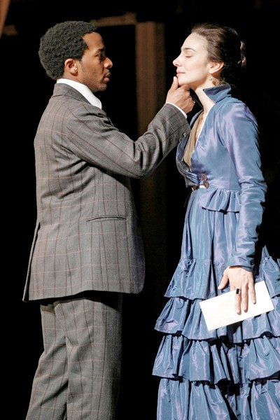 This is no minute achievement for a play in general, let alone one that's among Shakespeare's least regarded. Barely staged for the first few hundred years following its premiere, and still not among his more performed works, All's Well That Ends Well has been deemed one of the "problem plays" for the same reason that Sullivan and his excellent company, led by Annie Parisse and André Holland, make it seem so right: It's rarely easy to determine whether what you're seeing is positive or negative, and whether the characters experiencing it can (or should) recognize it as either in any event. In Central Park, on an unapologetically simplistic, Globe Theatre-y set by Scott Pask (with two levels, two staircases, thin curtains, and only representative set pieces occasionally brought in), Sullivan extracts from the story's consistent sorrow a fizzy tribute to the joys of having anything at all, and from the comedy the corrosive sense that everything else around seems to be in bad shape. The result is a production that offers no distinct highs or lows to speak of, but maintains a consistent level of deep, usually unspeakable, feeling from beginning to end. You hardly miss the peaks and valleys of Shakespeare's typically deployed outrageous fortune in this environment. Without focusing on the extremes that productions of this play so often skirt, you can easily devote more of your attention to the plight of Helena (Parisse). She's deeply in love with Bertram (Holland), the son of her recently widowed guardian, the Countess of Rousillion (Tonya Pinkins), but is hopelessly out of his class and hardly loved by him in return. Helena follows Bertram to France, where she makes a bargain with the ailing king (a fine John Cullum): If she cures him, he will grant her the hand of any eligible bachelor she desires. He agrees and she succeeds, of course demanding the unwilling Bertram in exchange. But even here, there are no explosions. Parisse's Helena is a staunch realist; she makes a show of choosing Bertram (and breaking, or at least tormenting, a dozen other male hearts in the interim), but not a spectacle. She trudges slowly, smiles uncertainly, and points demurely, all but wearing her unworthiness on her sleeve. Holland's response is wonderfully carved as well: a deep laugh that's met with such stony seriousness, it morphs before your eyes into the terror that Bertram will actually have to go through with this to maintain his relationship with the king he wants to be seen as favoring. Helena's trepidation may be endearing to us, but how can Bertram love a woman neither he nor she sees as his equal? The rest of the production, then, takes on an unusual Taming of the Shrew aesthetic, as Helena and Bertram gradually realize they belong together. This is a fascinating solution for the oddly dark tone of the play, justifying their often indefensible actions toward each other (most centrally, Helena's tricking Bertram into consummating their marriage to keep him to his hastily given word), while also balancing the back alleys of the story that see the Countess disintegrating as both her cherished children disappear on the Italian battle front. (Pinkins, if too sturdy to convince as the advanced age Jane Greenwood's costumes and Tom Watson's wig make her look, is highly affecting in the role.) The only casualties are the comic characters, whose impact has been flattened along with the normalizing of the rest of the drama. Neither Bertram's self-serving soldier comrade, Parolles (Reg Rogers), nor the countess's aide de camp, Levatch (David Manis), derive the hearty laughs these characters are capable of eliciting. Except for his first scene, in which Parolles chides Helena for her lingering virginity, Rogers layers most of his lines with dark anguish that doesn't let this destined-for-a-fall, vainglorious nitwit earn quite the thumping he deserves when his troopmates force feed him his own behavioral castor oil. (Michael Hayden and Lorenzo Pisoni strike the proper, stately tormenting notes as Parolles's captors and Bertram's friends.) Clowning is a small sacrifice for narrative and emotional clarity, however. There's even one unexpected new pleasure: Kristen Connolly, who plays Diana, the girl Bertram woos in Florence and who plays a vital role in his undoing. Sexy, saucy, and strong, she takes command of the second half of the evening, and emerges as a dynamic force for truth in a role that doesn't always make a stinging impression. But when she addresses the audience with her hands adorning her hips, in firm defiance of Bertram's advances while reasserting her position in the universal sisterhood, you won't be able to take your eyes off her. Nor will you be able to wipe her from your mind afterward. Like the rest of this All's Well That Ends Well, she makes a lasting, lustrous impression.