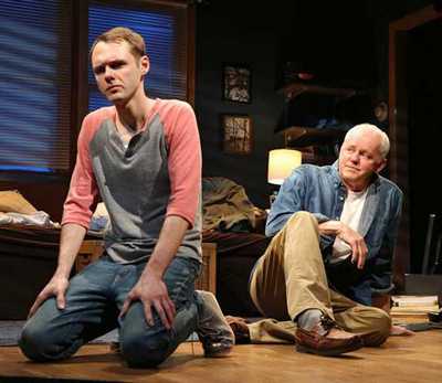 That someone is, of course, the title character. The 58-year-old Tom (David Morse) is described by his son James as a man who "got people to invest in this company he represented. Even though he knew that the company was... it wasn't actually worth anything. He thought he could get the stock price to go back up and eventually everyone would make their money back, butÂ… Everyone we knewhis family, my mom's family, my friends' parentsthey all lost, pretty much, everything." Levenson's play, which has been directed by Scott Ellis, is not about how Tom, James (Christopher Denham), or anyone related to them gets any part of it back. Oh, Tom makes a few overtures to his daughter's husband, Chris (Rich Sommer), who still works at the firm Tom defrauded, about coming back on board as a consultant, but it's pretty clear that no one really believes that will happen. Facing reality is the true focus of the evening. That reality happens to fall in 2009, at the height of the global financial crisis, when Tom emerges from prison after five years. And no part of it is rosy. Tom is fielding dueling part-time jobs at Borders and Starbucks, and is forced to beg James to stay with him in his tiny house. (The set, which juxtaposes that cave-like dwelling against jagged views of a world crumbling outside its doors, is by Beowulf Boritt, and is eerily lit by Donald Holder.) James, who had to drop out of Yale when the family money evaporated because of the scandal, is divorced from his wife and now selling stethoscopes while he takes a creative writing class to engage his mind. Karen (Lisa Emery), the one-time Durnin matriarch, has landed with another wealthy man, but has no desire to ever see Tom again.