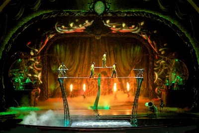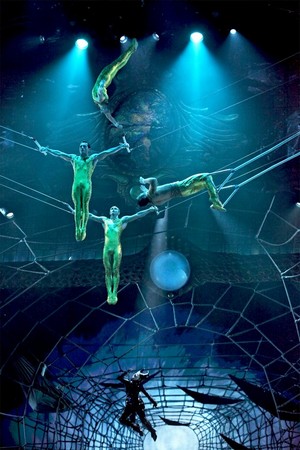 The upshot is, unlike the Circus of the Sun's last site-specific outing, Banana Shpeel (which played a mercifully brief run at Radio City Music Hall's sister theater, the Beacon, last year), this one really makes the most of its locale. The gorgeous Art Deco interior is thankfully untouched. But once that giant curtain rises, on an ever-shrinking succession of false prosceniums and a spate of ghoulish set pieces, you're transported immediately and entirely to a fantastical world that recalls James Goldman and Stephen Sondheim's ghostly musical, Follies, all coked up and staged at Bellevue Hospital on Halloween. But the effect works (as much as it needs to), convincing you (as much as it needs to) that you're seeing half-there shades of entertainment's past. Could that juggler and that weird snake woman have played RCMH once upon a time? Probably not. But... maybe. So kudos to StĂ©phane Roy for sets and props, Alan Hranitel for the costumes, and Alain Lortie for the lighting, all of which help sustain this tenuous illusion for a full two hours and 15 minutes. If not for them, you might be forced to focus just the tiniest bit on Zarkana's story, and that would be undesirable. Why François Girard, who wrote and directed the show, insisted on having as much of one as he tries is anyone's guess. It's persistent but so incomprehensible, whether as spoken or sung (musical director Nick Littlemore wrote the emphatically circuitous songs, which reduce matters of the heart to the echoes of a swirling acid trip), that you're bound to give up before the end of the first scene. There's a magician named Zark (played by Canadian singer Garou), who's pining for the woman (sung by CassiopĂ©e) who got away, and so he... Enh, who cares. (The "subplots," which include a pair of magic-performing dogs named Hocus and Pocus and a giant water fetus, are, amazingly, even less noteworthy.)