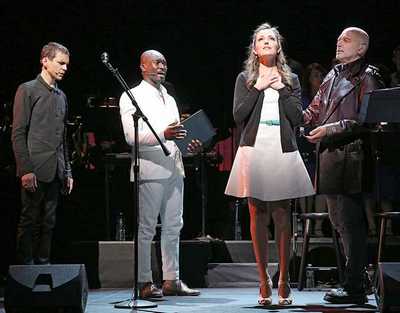 From his perch behind the stage-right grand piano, Newman joked early on about whether his adaptation could measure up to those that came before. "Is my Faust the equal of Goethe's?", he wondered aloud, to waves of chuckles from the audience. "Only time will tell." But once he started going, he made it quite clear that he didn't care about that. He was perfectly happy to sing his songs, rarely even standing up, in his customary rumbling, rolling baritone, and deliver his lines with the indifferent abandon one would expect of the Prince of Darkness, who after 4,000 years without a break has seen and done almost everything to almost everyone. It's a fine joke, and one that appropriately reappears immediately before the intermission break, but by itself it's not sufficient to sustain an evening. Though Faust, which premiered at the La Jolla Playhouse in 1995, and was seen (and heard on disc) around the country for a decade or so after, is loaded with fine pop tunes that boast Newman's distinctive light-Southern, soft-rock style, dramatically they're sedentary at best and catatonic at worst. When the Devil's opening number is called "You Can't Keep a Good Man Down," and he spends most of the show apparently engaged in a quest to be a Billy Joel opening act rather than convey threat or even basic power, you can tell this isn't a serious attempt at anything beyond a lightly strung-together catalog show. Newman's libretto, pasted together with clunky narration, could barely stay afloat in director Thomas Kail's production, even staged in a generally appropriate pop-oratorio style (augmented by a few flying clouds and not much more by scenic designer Donyale Werle) and backed by the 15-member Broadway Inspirational Voices choir (led by Michael McElroy, a Broadway leading man of no small distinction). Goethe's 19th-century epic doesn't require such filigree, of course: Widely considered one of the crowning achievements of German literature, and fusing classical religiosity with then-modern poetry, its chronicle of God's favored man, who signs a pact with Mephistopheles for what ends up to be more than merely his immortal soul, it stands on its own, and thrills yet today by virtue of being forceful, honest, and unsparing in its treatment of Heaven, Hell, and everything in between.