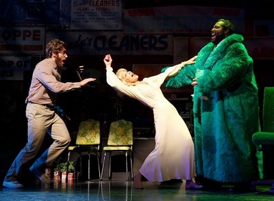 Everything she does is unique. Sure, there are those delectably definitive line readings in that untraceable urban accent ("Now, isn't that... bizth-awwrre?"; "Sorry, doc-tuh, doc-tuh, doc-tuh! Sor-ree, doc-tuh!"). But there's also an expert singer, whose now-rougher instrument nonetheless remains pure, and a daring interpreter; listen how she flips between chest and head voices in ways that don't initially jibe with Menken's tunes, but convey a pointedly scattered mindset that couldn't be more right for Audrey. (My favorite example is in the Act II opener, "Call Back in the Morning," which is typically fairly disposable, but here pulses with a fervor and necessity I have not encountered before.) And Greene's damsel-in-distress poses, guttural hip grinding, and Brechtian body contortions cry out that this is a woman who's more than the melodrama she inhabits: she's forever at war with who and what she can be. Thousands of words could be expended on everything that Greene does (and I suspect they will be before the end of the week), but what surrounds her should not be shortchanged. Director Dick Scanlan and musical director Chris Fenwick have brought the show back to its, ahem, roots, doing the full original book and score, with an eye toward the celebratory. (The night concludes with a film strip documenting the show's monumental statistics.) The result is something that is wholly authentic, but closer to a gala than the well-rounded Encores! mountings than have become the norm. Scenic designer Donyale Werle has gone simple, deploying not much more than a scummy Skid Row backdrop, rustled up a few green chairs, and wraps some flower chains around music stands; and costume designer Clint Ramos pulls out green socks and a fur jacket to represent the plant, Audrey II, as it's played first by child actor Anwar Kareem and later by the big-voiced adult Eddie Cooper. The show gets along without the puppets and frantic musical staging (Patricia Wilcox's straightforward choreography is fine), though they do inject a kitschy playfulness that Scanlan has otherwise downplayed.