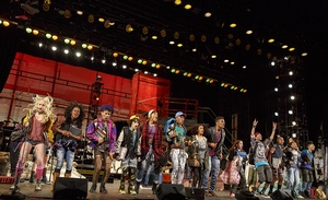 Some moments fare better. "Graffiti," which equates spray-painted subway creations to the creations of Picasso, Chagall, and Gauguin, successfully digs into the mind of an underground artist. (And MJ Rodriguez, who unleashes it here, does so with a lip-smacking flamboyance that ensures you believe every word.) "Where Are the People Who Did Hair?", led by an excellent Matthew Gumley, is at once a hilarious riff on entertainment appropriation and chilling proof of how quickly the current becomes passé. And in "Lullaby from Baby to Baby," the closest the evening gets to a sensitive theme statement, Rodriguez, Taylor Caldwell, and Kylie McNeill give aching voice to an important generation sentiment: "The world is full of people / Running / The world is made of / Runaways / Tomorrow you'll be a different child / Than the one you are today." Overall, though, the writing is neither captivating nor distinguished; Fenwick's nine-piece band sizzles, but Pinkleton's direction and Ani Taj's reluctant-feeling choreography fall short of its electric ideal; and this particular cast, though energetic, is only intermittently up to the material's largely modest demands. (The only other noteworthy actor is the dynamic Sophia Anne Caruso, of The Nether and Lazarus Off-Broadway and this season's Blackbird on, who sings the acidic "Song of a Child Prostitute.") Looking at them, though, reveals a stirring panoply of diverse humanity: short, tall, trans, cis, hiding, open, every imaginable color of skin and hair. (Cele Pahucki, whose head bears a literal rainbow with an emphasis on sapphire, is especially striking.) It is, by any measure, Joseph Papp's Public Theater mission writ larger than ever. Just don't stare too long. If you do, Clint Ramos's costumes start to distract with their tactical vivacity and squeaky-clean fashion sense, and once that happens, the illusion can never be pieced back together. It doesn't have anything else to offer, so the instant it leaves Swados's intricately constructed world, even for a second, is the instant it becomes permanently fake. Runaways, unlike its subjects but like its audiences then and now, doesn't live on the streetsit just wants to visit.