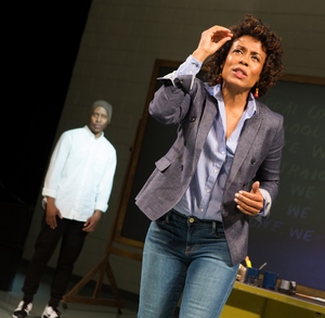 The play's title references the "school-to-prison pipeline," the metaphoric but sadly all-too-real pathway from juvenile scuffles with the law to incarceration. Pipeline hones in on a single family all but torn asunder following an altercation between a high school student and a teacher at the private boarding school that was supposed to be the saving grace for the teenager, Omari (Namir Smallwood). Things have not worked out the way his parents, Nya Joseph (Karen Pittman) and her mostly-out-of-touch ex-husband Xavier (Morocco Omari) had hoped. It's not hard to see why Xavier, a tough-minded successful businessman, wanted to get Omari away from the hood and give him a boost up with the kinds of advantages an upscale private education could provide. In case we need reminding, projections by Hannah Wasileski give us glimpses of the public high school where Omari would have attended, including images of student-on-student fighting and harried professionals who are trying to control things. As it happens, one of these harried professionals is Omari's mother, Nya, an English teacher at that high school. We get to see her at work in her classroom as she tries to encourage her students to think critically about the implications of a Gwendolyn Brooks poem, "We Real Cool," a work that comes up repeatedly in the production. There also are scenes that take place in the teachers' work room, where Nya interacts with the fiercely dedicated Laurie (Tasha Lawrence), a white teacher who has made the school and its students her life's work, but who is also at the end of her rope. Newly returned to her job after being injured, Laurie is now in trouble for not following protocol while breaking up a serious fight in her class. Also on hand is Dun (Jaime Lincoln Smith), one of the school's security guards, who has eyes for Nya but who also is depicted as a conscientious adult who strives to maintain order for the safety of all. It is important for us to see Nya and Laurie and Dun as committed to the students, so that we get a real sense of what they are up against in a place where, as Dun puts it, "the source of those fights is older than the bricks in this building." But Nya's greatest concern is, of course, reserved for her son, Omari, whom she seems unable to reach and for whose future she worries endlessly about. She has cause for worry; the resentful Omari's wrangle with the teacher is his third incident at the school, and he faces expulsion and even arrest. Before she can even come to pick him up, he has run away (leading to a well-played back-and-forth between Nya and Omari's girlfriend at the school, the self-aware Jasmine (Heather Velazquez), Sadly ironic is the fact that Omari's teacher was also trying to instill some social justice awareness and genuine passion in his (one imagines, mostly affluent and white) students. The brawl between them occurred during a lesson focused on Richard Wright's novel Native Son and its protagonist Bigger Thomas, a poor, uneducated black man, barely older than Omari, who commits a violent act. The teacher's prodding of Omari to try to unpack the cause of Bigger Thomas's pent-up rage only succeeded in bringing out the teenager's fury as a young black man himself, feeling goaded into taking on the role of what he saw as the token spokesperson on behalf of his race. As the narrative unfolds in the 90-minute, intermissionless production, so well acted under Lileana Blain-Cruz tension-filled direction, the play is just about flawless. The playwright is exceptionally adroit at peeling back layer after layer of meaning. She wants us to truly understand all of these characters, and she steadfastly refuses to allow any of them to wear the cloak of villain or victim. Nya's gift is one of unconstrained love, but is it not enough (she, herself, suffers from a panic disorder). Xavier, Omari's father has only child support checks and ineffective toughness to offer ("I'm the father. You're the kid," he says. "You are going to respect me"). The teachers, regardless of race, want to empower their students to think for themselves, but they are helpless in the wake of so much anarchic lashing out. The play ends with uncertainty. Will Omari be arrested for assault or will his mother's pleas on his behalf result in her being allowed to withdraw him from the boarding school and seek a new start? What hope we are left with is a sense that Omari has taken steps towards maturity, captured in a set of guidelines he has composed for his mother, and, really, for all caregivers and teachers. The first four are these: "OneHear me out. TwoLet me chill sometimes. ThreeKnow when to back off. FourKnow when to keep pushing." From Omari's perspective, these are so obvious as to hardly warrant the telling, but for the adults out there (the kind who want kids to read Gwendolyn Brooks and Richard Wright), it takes a leap of blind faith to let their young charges go out into the world.