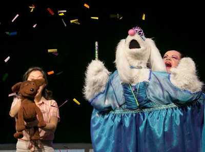 Of course, there are a few twists here. The instant love connection between Alex and Rue comes about in no small part because the former (Sarah Haines) is an adult woman and the latter (Lisa Helmi Johanson) is a puppy. And their union occurs much closer to the end of the tale than the beginning. But so what? Far more relevant is that Stacey Weingarten (concept, book, lyrics, and direction) and Kate Steinberg and Joshua Zecher-Ross (music and lyrics) have tossed together a breezy (65 minutes, tops) show that, though intended to help children learn of the virtues of pet adoption, is smart and structured enough to be irresistible to adults, too. And, through thorough application of time-tested staging techniques and charming puppets, it's unapologetically theatrical, too. Weingarten guides us gaily through the story, which is admittedly not always upbeat. The tiny brown Rue comes from an abusive home, where her owners lavish endless praise on their poodle, Prissy (a snugly smug Nate Begle), but have no love to spare for her. One night, Rue is visited by her giant, glittering, floating Fairy Dogmother (Gretchen Wylder), who sounds more than a little like Glinda from The Wizard of Oz, and is granted one wish. Rue chooses to have a happy ending, but realizes too late that that might only come about as a result of some not-so-happy events. Rue is kicked out of the house, and on the streets and subsequently in the pound meets the street-tough, one-eyed Squish (Avenue Q's Jennifer Barnhart, brusque, sympathetic, and perfect), and twin trick-performing dogs Apollo and Artemis (Jason Jacoby and Brendan Malafronte), before she's scooped up by a rescue time, transported to a shop in New York, and, after a few false starts, meets Alex and... well, you can guess the rest. The book is a crisp delight, hilarious and moving by turns, and the score glides without apparent effort through the ups and downs of the dogs lives and their dreams of eternal love with a "furever friend." (One number that recasts The Big Apple as "The Big Chew Toy" is especially clever; Alex and Rue's sole duet together, "Perfect Pair," is genuinely touching.) Weingarten's staging is brisk and inventive, as is Rhonda Miller's showy, paw-heavy choreography. And the puppets work in seamless concert with the actors to create the distinct and lovable characters, canine and human alike, who accompany us on this adventure. If Rescue Rue has a problemand that's a big "if"it's that it's pretty lightweight even by the standards of most children's musicals. As it is, the story feels a bit stretched out, there's not much in the way of conflict outside the opening scene at Rue's first home, and the last couple of scenes play a bit too much like commercials for Badass Brooklyn Animal Rescue. Tightening and reinforcement would not be bad things here. But so much of Rescue Rue is so good, and it's all so heartfelt and wittily executed, I'm wary of suggesting that Weingarten and her collaborators tinker with it too much. It does what it needs to in a tuneful and entertaining way, and knows just how and when to strike your heart and funny bone. Yes, you (and, advance warning, probably your kids) will come out of the theater wanting to adopt a dog. More important, however, you'll come out reminded that love at first sight, however hokey and improbable it may be, actually can happen.