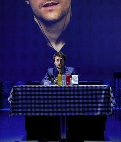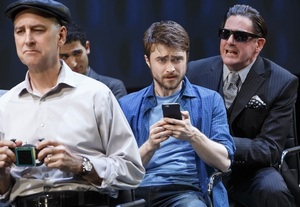 The darkest horrors Graham and Rourke unleash are aimed at the first group, admittedly, demonstrating how your iPhone, for example, uses wireless networks to keep track of where you walk and when you walk there, or that its camera collects invisible (and damning) information with every shot you snap, reinforcing with unsettling strength the notion most of us already have that our most trusted devices are never more than 30 seconds away from betraying us. But if you've ever used little services called Google or Facebook, you're no better offthe wrong people, or the right people with the wrong ideas about their rightness, can find out anything about you with just a few clicks of a mouse you're unlikely to ever get close enough to see. Perhaps the most daring of all the conceits employed in this two-and-a-half-hour evening is the revelation (reminder?) that in 2016 even an old-fashioned theatre ticket is no guarantee of safety. Pony up your money on the website, and your name, address, and phone number become, for all intents and purposes, someone else's property. And once that happens, even your seat in the otherwise secure fortress of Lafayette Street is all but a pedestal put before a firing squad: Once you learn just how much a target you are, you're already dead. Sorry for all the vagaries here, but to give too much away about what you give awayand how the creators of Privacy exploit it for your edificationwould be to spoil most of the fun of this otherwise stilted and saggy enterprise. If you don't enjoy the surprises about each new way technology takes advantage of you, there's no way to fall back on such antiquated notions as "plot" and "characters"because, for all intents and purposes, they don't really exist here. The closest we get is a twentysomething man known only as The Writer (and played by Daniel Radcliffe, of Harry Potter fame and several other notable New York stage credits). Devastated after a breakup, he takes to the pleather couch of a psychologist (Reg Rogers) in search of guidance, but is reluctant to tell too much lest he lose what little control over his life he has left. His quest to understand his place in an increasingly un-private world, whether it's stalking his ex via target searches or pondering sudden rapid heart rate over a Web-based fitness app, eventually sends him hurtling to New York, where he tries to start anew and reconnect with people on a level that's less invasive and less digital than any he's known in a while.
