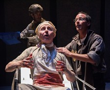 Despite the soldier's mantra "God is on our side," events spiral out of control despite the best efforts of their chaplain, Croop, well-played by Christopher Marshall (and the role originally essayed by Alan Rickman in the BBC telefilm), who sounds the only reasonable notes among the military contingency. The voice of reason' in Barker's work falls to Gaukroger who becomes an observer, a philosopher and ultimately a victim as he's forced to watch the soldiers destroy the monument he's labored to complete. Pity In History illuminates the conflict and contradiction that inherently come to light when chaos and art face off against each other. No doubt this is the reason PTP/NYC paired Barker's play with Tom Stoppard's Arcadia for this summer's repertory season. These two monumental playwrights may seem diametrically opposed but these two works share the mingling of idealism, cynicism and fanaticism to expose the eloquent spark of creation that remains ineffable.