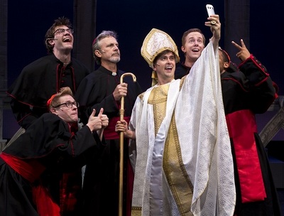 That's no small trick, but Moran, Pappas, and their boisterously resourceful director, Peter Flynn, have made it look simple. They have reimagined His Holiness as a comic book superhero, complete with origin story: A young boy, coincidentally named Pope (and played, with boundless energy, by Sam Bolen), wants nothing more than to lead the Church and gets his dream through a series of fortuitous and unlikely circumstances. But surviving at the top of the Vatican power structure isn't easy, thanks to the evil Archbishop (Ken Land, uncompromising and unassailable) who longs for a return to the old days of the Church: stress the dangers of straying and using its might and inestimable wealth to enforce righteousness, rather than profess Pope's modern gospel that references, among other things, blueberry muffins and burritos. Moran (book and lyrics) and Pappas (music and lyrics) unleash their wild adventure, which spans the globe and conventional notions of time, without dwelling overly much on the underlying doctrine. This means that all that burbles to the surface is fun, in copious amounts, as Pope rises and falls, makes friends and enemies, and learns an expected lesson or two about the value of humility, contrition, and even forgiveness. The score is a fine blending of old-fashioned melodrama, Saturday morning cartoon, and religious influences that's accompanied with affectionate gusto by musical director Adam Podd and his band. It's a lot to juggle, but everything flows without straining thanks to Flynn, choreographer Wendy Seyb, set designer Rob Bissinger, and costume designer Vanessa Leuck. They play up at every turn the notion that this is a graphic novel sprung to life and remain relevant; however zany the proceedings get (and, especially when the flashbacks, fake beards, and hallucinatory gospel singalongs hit in the second half, they get pretty crazy), they're always grounded by a message that's worth discussing. Nor do the performances flag. By virtue of almost nonstop stage time, the affable Bolen and the pitch-perfect Land make the biggest impressions, and share an effective chemistry in the many scenes in which their ideologies clash. They receive glowing support from Britney Coleman as Mary Elizabeth, Pope's childhood flame and current nun; Dylan S. Wallach as a bloodthirsty journalist who becomes the Archbishop's unwitting pawn; Jason Edward Cook as Duncan, a cardinal who's so thrilled to be the Archbishop's friend, he'll go along with all his dastardly schemes; and Jarid Fabuel and Gilbert L. Bailey II as, respectively, God and Jesus, if not exactly the way you may be anticipate seeing them. But even down to the tiniest roles, everyone is playing for dramatic and comedic keeps. Their efforts pay enormous compound dividends until the last ten minutes or so; at that point, the underwhelming climactic confrontation between Pope and the Archbishop, and the mawkish, moralizing finale arrive, and both are distractingly out of sync with what precedes them. Some additional tightening and reconsidering would definitely help ensure that the evening's wrap-up is, like the rest of Pope!, meaningful and wholly delightful.