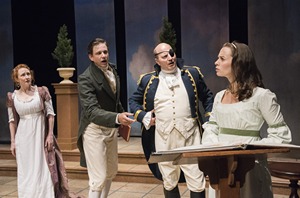 Directed with stylish panache by Cheryl Faraone, the plot of Stoppard's Arcadia focuses on two sets of people from the Coverly family, one in the early 19th century (1809-1812) and one in the late 20th century (around the turn of the millennium). The setting for both time periods is the samethat of a room on the garden front of the Coverly's large country house, Sidley Park, in Derbyshire. As Stoppard's play travels back and forth in time, the set and props remain the same for their inhabitants even as they're put to different use. As the play opens in 1809, the gifted 13-year old Thomasina Coverly (a charming Caitlin Duffy) is being instructed by her equally gifted tutor, Septimus Hodge (the terrific Andrew William Smith) in math when Thomasina suddenly asks for a definition of carnal embrace. It becomes clear Hodge has been having a dalliance with the wife of Ezra Chater (a properly befuddled Jonathan Tindle), a poet of dubious merit who is staying at Sidley Park at the invitation of Captain Brice (Steven Dykes), Thomasina's uncle and brother to Lady Croom (a marvelous Megan Byrne), Thomasina's mother. It seems Hodge and Mrs. Chater were seen in a gazebo by Lady Croom's landscape architect Richard Noakes (Sebastian LaPointe) who felt obliged to report what he saw to Mr. Chater. Fortunately, a duel is avoided and a signed copy of Chater's latest poetical epic (The Couch of Eros) is bestowed on Hodge. This book and the personal notes stuffed inside it will play a pivotal role in the lives of the family almost two hundred years later.