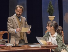 The present day Sidley Park finds two academic researchers eager to use the holdings of the Coverly family to prove their different theories. Hannah Jarvis (a commanding Stephanie Janssen) hopes to find information as to the identity of a hermit who lived on the estate, while Bernard Nightingale (an appropriately irritating Alex Draper) is searching for evidence that Lord Byron had visited the estate and perhaps even been involved in a scandalous duel. Hannah and Bernard get off on the wrong foot even as they're assisted in their research by a promiscuous Chloe Coverly (the appealing Eliza Renner), her brother who's sweet on Hannah, Valentine Coverly (Jackson Prince), and their younger brother Gus Coverly (Manny Duran) who hasn't spoken since the age of 5 but who has a knack for uncovering pivotal documents at precipitous moments. (Note: Billy Crudup played Septimus Hodge in the 1995 production and, in a coup de theatre, took on Bernard Nightingale in the 2011 revival.)