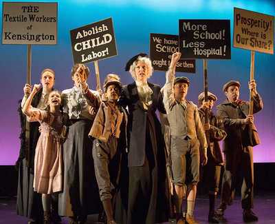 Make no mistake: That's not a bad thing. But you never get the sense from this thoroughly polished, thoroughly educational outing that it's exactly what writer Cheryl E. Kemeny had in mind. In crafting the character of Mother Jones, really Mary Harris Jones, chief rabble-rouser and socialism proponent of the late 19th and early 20th centuries, she has one and only one point to make. Specifically, Jones's: that child labor is bad, that the factory owners are making too much money, and so on. Every minute, every song, every character (if they can really be called that) in this musical is designed with only that, and little else, in mind. So it's an even greater accomplishment that Wintersteller finds genuine humanity in a woman written to be a symbol. Yes, there's a lot of anger on display, as you'd expect from someone determined to bring down the capitalist system in its current form, the male power structure, and probably President Theodore Roosevelt. But Wintersteller's natural maternal softness, taken in concert with her luxurious soprano and relative youth (the real Mother Jones was 66 in 1903, when the story unfolds; Wintersteller looks an especially spry 40, old-age wig notwithstanding), highlights the loss and even the optimism that's thrust her to this point. The message, it becomes clear early on, is not merely that her cause isn't important, but that great work will propel unlikelyeven unworthypeople to do great things. Mother Jones's defining number, then, isn't, as you may expect, "Raise a Little Hell," technically her "I want" song, in which she strives to unite miners' wives and children to her side, but rather "Memphis, 1867," in which she describes the accident that robbed her of her husband and children and bestowed a new purpose on her life. Though Mother Jones is visibly struggling to hold back the agony the memory still inflicts on her, a flash of uncomfortable reality bursts within Wintersteller's eyes, suggestingif only for a secondthat this woman might not make the same trade again if she could. Some things, she appears to know but is too frightened to admit she believes, are just too important. Seeing those vividly divergent personalities at work in the same moment anchors Mother Jones as someone you want, even need, to know, and is the crowning achievement in a work that tries much, much harder than it needs to in order to achieve the same effect. What makes this particularly interesting is that Mother Jones is the star part, rather than the lead. The real center of the action is Jenny Markem, a millworker who wants to improve conditions, and admires Mother Jones largely from afar, only to eventually meet her and become her official protégé. Lizzie Klemperer plays her with significant strength and a gorgeous singing voice of her own, but the character is so conventionalexperiencing the expected tragedy, and the even more expected romance with a union organizer (Kevin Reed, fine)that there's not really anywhere for even an inventive performer to take her. That's true of the rest of the show as well, which Kemeny has plotted with obvious care, and which has been directed (by Michelle Tattenbaum), choreographed (by Clare Cook), and designed (sets by Scott Tedmon-Jones, costumes by Stephanie Levin, lights by Isabella F. Byrd) with visible affection. But as you might expect from a watered-down, safer spin on Ragtime or Rags, one that plays with the stilted mien of a work intended for elementary school assemblies, no risks are taken and no nuances are left to chance. You're meant to take away from the evening one thing, and only one thing, and you will take it because there's nothing else to consider. Kemeny has worked wonders within those rigid confines, true, and left no seams to be filledbut also no cracks through which the light of theatrical innovation may shine. So it hardly matters that the rest of the cast is fresh-faced and adept, singing and acting beautifully (Frenie Acoba makes a strong impression as a young mill girl, as does Marissa Miller as an older girl of conflicted loyalties), that the score ranges from above-average serviceable to downright catchy, or that, for all intents and purposes, there is no ending. Without spoiling (Wikipedia can do that for you, if you choose), the Children's Crusade ended anticlimactically, so how or why would something this faithful depart from the formula? Which is why you appreciate Wintersteller all the more during her moments onstage. She's a reminder of what Mother Jones really represented: a dream given form, someone willing to work herself, perhaps literally, to death in service of all those who couldn't or wouldn't speak up themselves. And whenever she's singing or speaking, you're ready to drop everything and follow her anywhere. It's undoubtedly not quite the way Kemeny intended to communicate the theme of her show, but it's far more incisiveand exhilaratingthan the rest of the show we got.