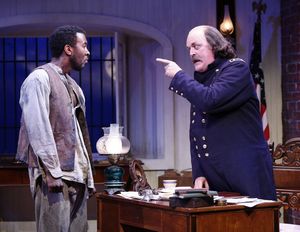 General Butler (Ames Adamson) is newly ensconced as the commanding officer at Fort Monroe. He is not a career military man but has obtained the appointment owing to his connections and President Lincoln's immediate need to quickly quash the rebellion by the Southern states. The "servant" here is his aide-de-camp, Lieutenant Kelly (Benjamin Sterling), a West Point graduate who takes his own military career most seriously and who can barely keep a civil tongue in his head when being lectured to by the newcomer, who until very recently was a civilian lawyer. General Butler does come off as a bit of a windbag, going on and on about how "astonished" he is to find himself being interrupted with something he has no interest in. It seems a trio of runaway slaves has appeared at the fort, and one of them "demands" to speak with the general about being granted sanctuary. General Butler cannot believe what he is hearing; no one makes demands of him, he assures the lieutenant, other than the President, those above him in military rank, and his wife. In the end, and against his better judgment, the general agrees to meet with the slave, Shepard Mallory (John G. Williams), with the intention of sending him back, per the requirements set out by the Fugitive Slave Act. He is sympathetic in principle, but, as he puts it, "I am sworn to uphold the law. I cannot break the law, even if I disagree with the law." What he hasn't counted on, however, is Shepard Mallory, a man whose feisty demeanor, determination, and ability to hold his own in any argument fly in the face of anything the general ever imagined he would encounter from a slave. As the two spar, you might want to roll your eyes at Butler's query: "Are all Negroes like you?" But the question is genuine, rising from the general's isolated worldview. And although Mallory answers with sarcasm, it becomes the start of a surprising relationship that leads to Butler being forced to confront and be held accountable to his purported values. Talk may be cheap, but talk is the coin of the realm for lawyers, and we discover that General Butler is a very good one. How good, he proves in a meeting between him and a confederate major (David Sitler), who has come under a flag of truce to claim the slaves. It's probably not too much of a spoiler to report that the major leaves chastened and empty-handed. Butler clearly is dealing with a very serious subject, one that resounds to this day. Black lives mattered in 1861 no less than they do now. In telling this story, the playwright has accomplished two fairly remarkable things. First, he has taken an actual historic event and characters and turned it into an engrossing, non-pedantic play. Both General Butler and Shepard Mallory were real people, and the actions taken on behalf of fugitive slaves at Fort Monroe became an important step in the road to emancipation. In the play, Mallory shows himself to be a hero ten times over, but as General Butler evolves, a new hero and leader emerges. More surprising, the play is delightfully funny, packed with wit, farce, and slapstick that rarely seem out of place with the content. Comedy may be the spoonful of sugar that helps the medicine go down, but it also humanizes things in ways that a straightforward history play would be unable to do. Each of the characters, including the Confederate officer, is splendidly realized, and the production by the New Jersey Repertory Company is first-rate all around, with great ensemble work by the four-man cast, under Joseph Discher's sprightly direction. All told, this is a terrific show for history buffs and for anyone who can appreciate the savvy mixture of a serious topic with a comic touch.