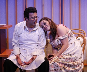 That's the setup for Idris Goodwin's Black Flag, the first of three works that make up Summer Shorts Series B, the second half of the tenth anniversary festival of short works at 59E59 Theaters. While the setup itself feels contrived, the play, as directed by Logan Vaughn, does a good job of exploring issues of racial insensitivity, the naivety of a young person going out into the world for the first time, and the meaning we give to symbols. Ms. Gunn is especially effective as the conflicted Deja, wanting to focus on her studies, recognizing the personal (rather than the unintentionally offensive) meaning that Sydney applies to the flag, yet offended nevertheless. Deja is goaded by her Asian American boyfriend (Ruy Iskandar) to be more assertive, but she remains unsure, seeming to understand that you can't impose empathy on someone else. Sydney will have to get there in her own time, as the play's ambiguous ending shows. The second play, and the most tightly constructed, is Queen, adapted from a Gabriel García Márquez short story by playwright Alexander Dinelaris, a talented wordsmith who authored the musical On Your Feet! and the screenplay for Birdman. Directed by Victor Slezak, this short piece tells the story of a world-weary prostitute (splendidly portrayed by Casandera M. J. Lollar), a regular at a café run by the middle-aged Joe (Saverio Tuzzolo). Every evening at precisely 6 p.m., she shows up for a drink and dinner that Joe, who has long been in love with her, provides at no cost. They have a friendly, bantering relationship, and Joe feels particularly protective of her, even though he has no expectations of anything more. On this particular evening, it is Queen who is looking for something more from Joe, a favor that puts him on the spot. Will he help her, even if it means compromising his seemingly unsullied record of honesty? Like Black Flag, the evening's first play, this one ends ambiguously. But, really, the plot turn is less important than the well-honed portrait of disparate characters who come together through mutual loneliness and need. After two thought-provoking works, the trio of plays ends with a very silly extended comedy sketch, a spoof of film noir classics like The Big Sleep, itself a convoluted tale of mystery and intrigue. Titled The Dark Clothes of Night and written by Richard Alfredo, the play is filled with puns and sight gags that are often very funny, but it does drag on and eventually outstays its welcome, like a too-long SNL skit. Plenty of laughs along the way, though, and splendidly performed by Dana Watkins, Sinem Meltem Dogan, and James Rees under the madcap direction of Alexander Dinelaris, the playwright who contributes Queen to the series. Summer Shorts Series B, with a running time of 90 minutes, alternates with the three plays that make up Series A, now through September 3. It's a good way to catch up on a group of pocket works written by a talented and varied group of playwrights.