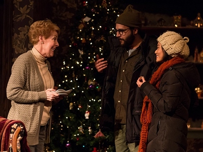 No, this is just what Baker and Gold do, and better than almost anyone else. They're masterful minimalist storytellers, she crafting dialogue that maximizes what's usually a very few words, he evoking the most sumptuous emotions from the most outwardly ordinary situations. So it's perhaps not surprising that John, which is all about the stories we tell each other and ourselves to survive, brings out what just may be the best to date in a duo that's already scored such unqualified successes as Circle Mirror Transformation and the Pulitzer Prizewinning The Flick (which is currently playing Off-Broadway). It's evident, as mentioned, from our first glimpse of Mimi Lien's eyebrow-raising set: a dazzlingly intricate bed-and-breakfast in Gettysburg, Pennsylvania. It's a curious mélange of styles, ranging from backwoods-rustic to faux-French, and is choked floor to ceiling with collectibles: miniature houses, candlesticks, teddy bears, and dolls, all of which may well have exploded from beneath the majestic upstage Christmas tree. It's homey, yes, but unsettlingly so; though nothing looks wrong, even as choked in the shadows of a late-November night (Mark Barton's lighting design could not be better), it's all so perfectly imperfect that you can't shake the feeling that somethingmaybe something bigisn't quite right. You'll revisit that feeling many times over the course of the play, though things appear normal enough as soon as we begin seeing who's colliding here. Two youngish guests, Elias (Christopher Abbott) and Jenny (Hong Chau), arrive at the door and are greeted by the kindly but just-a-bit-off proprietress, Mertis (Georgia Engel). She's firmly doting to them, practically grandmotherly, with her offer of peanut butter fudge and descriptions of her strict diet ("67 pounds in four months," she whispers, conspiratorially and proudly). The couple is running late, and in the midst of some sort of disagreement, so no one tarries, and Mertis brings the night to a close by stepping to the nearby grandfather clock and moving the hands ahead to the next morning.