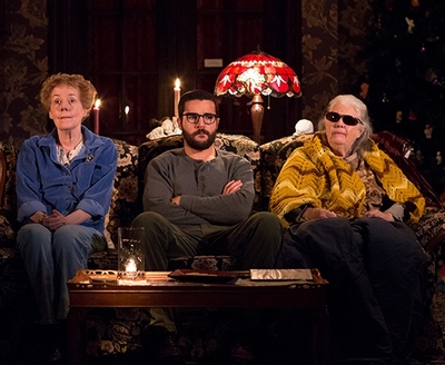 "You know it's haunted, Mertis," barks her blind friend, Genevieve (Lois Smith), as part of her daily visit, during a recitation about a strange rustling sound she believes follows her wherever she goes. "You know it's capable of anything." And after three acts of seeing these four people witness their lives and relationships unravel in ever-more shocking and harrowing ways, all apparently centered on a mysterious spirit of malice (named John, of course) who infects their existences, chances are you'll find yourself wondering if Genevieve is right. But you will undoubtedly find yourself on the edge of your seat during most of that time: nearly three and a half hours, of which not so much as a second is wasted. John is a spine-tingling spellbinder in the grand tradition of Martin McDonagh and Conor McPherson, yet thoroughly American in its attitude and execution. Baker builds up the suspense so gradually, but so completely, that eventually anything that pierces it invokes shivers (Mertis reading from The Call of Cthulhu, a player piano firing up of its own accord, and the Christmas tree's lights operating on their own sentient logic were among the most unsettling for me, but there are dozens more). And the third act, in which Elias and Jenny reach their full, violent boil, is every bit as searing for the emotions on display as for their disquieting backdrop. This is not as profound an evening as The Flick, which contains within it a full deconstruction of class, race, and success in the contemporary United States. But in some ways it's an even more withering examination of the human condition and the fiction we use to patch its holes. Elias and Jenny, trying to make their partnership of three years last a fourth, are wrapped and trapped in cultural detritus they can't sweep away, and are bound to determine the optimal level of joint honesty they can bear. Mertis, slowly watching the disintegration of her second husband, must comfort herself recollecting how they met in the wake of her disastrous and suffocating first marriage. So powerful do these characters realize stories are that Genevieve even obliterates the fourth wall, and postpones one of the intermissions so she can describe how she went mad in seven stages. That explicationreally a continuation of an earlier one in which she outlined how her husband possessed hermay be the most riveting here, delivered as it is by Smith with an unforgiving but appealing gruffness that underscores exactly how much further down the track to true independence Genevieve has progressed. But it's also emblematic of Gold's work throughout, treating something that's disturbing, even impossible, so that it's not only stripped naked, but becomes vital: a moment that, by virtue of being at odds with reality, is ultimately closer than most of what surrounds it. Gold ensures that everything is like that, from the designs (which, counting Bray Poor's absorbing sound, is one of the most unified I have ever encountered onstage) to the performances. Engel uses her typical daffiness as a shield behind which Mertis can hide, but when she lowers it, we get to know a woman wracked with incredible pain and loss, but who's also striven well beyond our understanding (maybe too far) to overcome it; it's a beautiful, humorous, achingly honest portrayal that works because of how hard Engel tries to convince you it's anything but. Abbott, too, is full of surprises, and he buries fascinating levels of Elias's own hurt within an angry outer shell that he only slowly sheds to reveal a man who's far more complex, and less predictable, than we at first suspect. If there's a flawand that's a big ifit may rest in Chau's overeagerness as Jenny; she comes across as so dementedly bright, to the point of desperation, that descending to the depths into which Jenny ultimately falls is a slightly less smooth process than is ideal. But even within that potential overestimation (which may work itself out with time), Chau is wonderful at letting us see every frustrating facet of this woman who's never entirely sure who she is. Baker, however, has no such problems, and displays as an artist and a technician a total confidence and self-assuredness in John. She hasn't deployed a single gimmick, but instead uses to the fullest every tool at her disposal, up to and including the world beyond the proscenium, to explore and critique what storytelling means for the participants and the audience alike. And then, on top of that, she tells an engrossing storyone that other playwrights will struggle to match, let alone top, this season. In Act III, Elias and Jenny discover the hard way, when they become enmeshed in a legend of their own making, just how dangerous and necessary such acts can be. It's maybe the best scene Baker has ever written, pungent and transfixing in how deep it cuts and how much it says with so little. But it's but a tiny piece of John, which plumbs the soul, head, and heart so more fully, and more excitingly, than even the spookiest ghost story could possibly manage.
