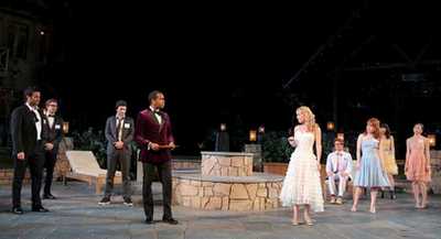 This is not necessarily a good thing. Oh, there's plenty to like about the new tuner that just opened at the Delacorte Theater in Central Park, and is scheduled to run through the end of the week. And the sheer joy it takes in being just plain different is smack at the top of the list. But it's impossible to shake the feeling while watching this spit-polished production that the show is this only because it doesn't know how to be anything else. The show's highest and lowest points come from the same two places: Alex Timbers and Michael Friedman. These Off-Broadway theatrical masterminds joined forces beginning in 2009 to create Bloody Bloody Andrew Jackson, a rollicking emo interpretation of the controversial seventh president of the United States. It managed only a brief Broadway run, but filtering its classic subject through contemporary culture overall worked for librettist-director Timbers and composer Friedman, so it's no surprise that they decided to team up again and fulfill those same roles here. It's not difficult to understand what attracted them to William Shakespeare's bizarrely off-kilter anti-romantic comedy of the same title. Though jubilantly joyful, it's laced with a melancholy that separates it from The Bard's goofier writings, and presents certain tonal challenges in its disquieting final scenes. It doesn't exist merely on one plane, and thus requires a creative team who will recognize and respect that, and devise clever solutions for dealing with the dilemma. This means laying the groundwork early and adhering to it. The King of Navarre persuades his three compatriots, Berowne, Longaville, and Dumaine, to abstain from earthly pleasures and devote their hearts, minds, and bodies strictly to studya plan that falters almost immediately, when the Princess of France and her three attendants arrive on royal business and insinuate themselves into the men's hearts. On many levels, this suggests a more standard musical-comedy treatment, if a star-free one (though the pompous Spanish Armado could be a good fit for a headliner). Standard, however, is not what Timbers and Friedman do. Though Timbers has recently made forays into more commercial fare (Here Lies Love, Peter and the Starcatcher), his most striking efforts were with Les Freres Corbusier, such as A Very Merry Children's Scientology Pageant, which set real children on the modern religion's shakier tenets to hilariously chilling effect. And Friedman, with [I Am] Nobody's Lunch, Gone Missing, and This Beautiful City (all for The Civilians), used a beautifully awkward show-biz musical sensibility to transform stodgy documentary theatre into something memorably fresh. Bloody Bloody Andrew Jackson was just the right proof of concept, examining whether the celebrity of the early 19th century and the celebrity of the early 21st could genuinely mesh, and whether we'd learned anything in the intervening 200 years. It could be silly one moment and tragic the next because that's how history itself operates, and because Timbers and Friedman were writing the rules from scratch. Alas, neither applies to Love's Labour's Lost, which, despite a few adventurous bits of construction, is mostly conventional Shakespeare that possesses its own kind of timelessness. (Men who think they can take women off their minds and get things done are in for a rude awakening, and so on.) The inconsistency mounts quickly. Leaving the dialogue largely Elizabethan while moving the action to the present day and rendering the lyrics in here-and-now American English, suggests that Timbers and Friedman were setting up barriers they could then smash. But they don't succeed at that because the play didn't need ironic clarification to begin with: They're forcing it to be something it never was, which gives Friedman's score nothing to either connect with or respond to. The relationship between the structural elements just plays as confused and confusing. Friedman's songs are often delightful, from the testosterone-fueled "Young Men" opener to the energetic almost-finale, which finds the entire cast celebrating the opportunities life at precisely the wrong moment. But they interrupt, rather than deepen, the story and the characters, which doesn't leave Timbers's script (which has significantly cut down and simplified the original) much room to develop anything on its own. It's easy enough to enjoy the score and the book, but there's no real way to enjoy them together. With the help of John Lee Beatty's handsome courtyard set, Love's Labour's Lost falls short of being anything more than a glitteringly attractive mess. A few souring examples out of too many: The first scene, which mocks the notion of injecting songs into the play; the straining, subtlety-stripped "Did I Not Dance With You in Brabant," in which an indifferent Boyet (Andrew Durand) conducts a he-says-she-thinks song achingly similar to Frank Loesser's "Been a Long Day" without the charm or wit; a late confrontation, in which the four men unknowingly one-up each other with declarations of love for their women, which buries itself under every go-for-broke trick in the book (and Jennifer Moeller's bountiful, upscale costume plot), up to and including a desperate and impressively incongruous A Chorus Line parody, and still doesn't justify itself; Armado being tweaked into too puffed a buffoon to occupy the solid supporting position the role demands. Caesar Samayoa gives that role his all and then some, and is grating in it for his troubles, but there's no way to take it down. Far better are the lovers: Daniel Breaker (King), Colin Donnell (Berowne), Bryce Pinkham (Longaville), Lucas Near-Verbrugghe (Dumaine), Patti Murin (the Princess), Maria Thayer (Rosaline), Kimiko Glenn (Maria), and Audrey Lynn Weston (Katherine) prove a spunky, likable group who summon just the kind of daffy, infectious On the Town energy required. Donnell and Breaker strike the best balance between amorousness and amusement in their 