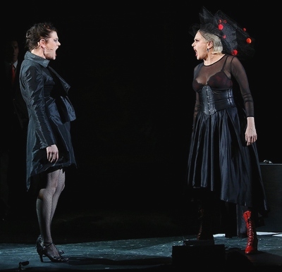 The ungainly title is a chief example of this. The story really does take place inside the arm of an ordinary working-class shlub (who's depicted only in projections by Petr Hlouek, who also designed the girder-heavy set), in a town called Elbowville. Other cheekily named settlements include Eyescokette, Knee York, and (sigh) Texass and Penisylvania. Though Jónsson has stated he intended this to dissociate events from any specific place or people, it creates a huge tonal discrepancy that creeps into every aspect of the writing. Sure, there are a scattering of clever applications of this ("We already owe Monbrezt Mutual 10 million lymph notes"), but the overall lack of genuine wit makes it all but impossible to take this serious subject seriously. Without that underpinning of grim reality, there's very little else to chew on. The book is poorly sketched out, with elements introduced without reason and discarded without notice, crucial characters vanish from the action for untenable periods, and subplots vary from the useless to the inane (one character dreams of being cuddled, another muses endlessly on the relative efficacy of shoulder pads versus implants). The score barely qualifies as such, with almost every number ending abruptly before making a point, and none evincing any real sense of unity or dramatic purpose; the biggest production number contains more superfluous tapping than any musical I can recall since Billy Elliot. (This show's choreographer, Lee Proud, also worked on that one.) It perhaps goes without saying that the sound design (by Carl Casella) is more about piercing volume than clarity. The costumes, by Hrafnhildur Arnardóttir and Edna Guðmundsdóttir, blend crisp business suits with grotesque fun-house-mirror creations for no reason I could discern. And the lights, by Jeff Croiter and Cory Pattak, are sometimes metal-concert hyperactive and sometimes so lazy that it seems as if they can't be bothered to light up the general section of the stage in which someone is speaking or singing. Ingólfsson's staging is serviceable, but spare and rarely imaginative. Aside from Huffman and Shindle, who work harder than any actors should have to in order to elevate their roles, the performers often visibly struggle to make sense of what they're saying and doing. Patrick Boll as the token nasty functionary, Jesse Wildman as the divisive love interest, and Graydon Long as the reluctant hero do what they can, and each manages to shine for a few moments. Less lucky is Marrick Smith, who plays Peter, the man at the center of the action who unwittingly develops the system that destroys the economy: Though a nimble dancer, his acting is wooden and his singing is uncomfortable to listen to for long, his shaky and falsetto-prone voice an ill-fitting match for a role that demands hardcore rock screaming. Not that anyone could save the part or the showultimately, the sensibility is too off-kilter and the execution too haphazard by American standards of polish. Good ideas on their own simply aren't enough; you need writing and an atmosphere that will support it. While watching this musical, I was reminded not of Urinetown, which would seem to be its natural spiritual progenitor, but of Enron, the British play that flopped hard on Broadway in 2010 because it was far too interested in fantastically retelling history Americans already knew the sobering particulars of all too well. The same principle applies here, of course, and without the added benefits of real people and real emotions to latch on to, Jónsson's surreal leaps of fancy aren't ones we have any obvious reasons to make. There's unquestionable value to the important messages the playwright presents. But it's all contained in elbow. When you're going to see a musical, don't you prefer to get punched in the gut?
