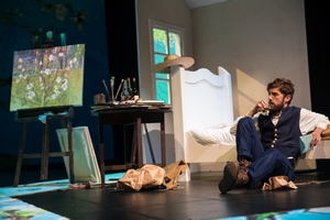 If nothing else, the production, under the helm of the company's founder, executive artistic director, and playwright Eve Wolf, is a unique exegesis on the creative vision and deteriorating mental health of van Gogh toward the end of his life. The work's theatrical content is drawn from van Gogh's letters to his brother Theo. Its musical content consists of live performances of chamber works and art songs by Debussy, Fauré, and other composers. The continuous and ever-changing display of the artist's paintings comes courtesy of David Bengali's sharply-focused projections that aim for depth and detail. When we first meet Vincent (Carter Hudson), he is immersed in the life of the starving artist, literally, if his pleas to Theo are to be believed. "These four days I lived mainly on 23 cups of coffee," he writes in one missive in which he urgently asks for funds from the man who, by most accounts, supported the artist financially and emotionally his entire life. The tenor Chad Johnson, who appears as Theo, performs several of the art songs but never speaks in character. Instead, we often see him reacting intently and with great empathy as Mr. Hudson reads aloud Vincent's communications. You do get a feel for the strong fraternal ties between them as Vincent shares his thoughts on his art, his fears, and his frustrations at not being able to fully capture on canvas all that he perceives through his senses. Meanwhile, there is the music, complete works performed by a group of gifted musicians (piano, two violins, viola, and cello), along with masterful singing by Johnson and mezzo-soprano Renée Tatum. While the music does not seem to be commenting directly on the action, it is perhaps supportive of the hypothesis that van Gogh's neurological makeup included a condition known as synesthesia, in which the senses "cross" one another in the brain so that one might "see" music or "hear" art. This provides the double-meaning of the production's title, with its reference both to van Gogh's "ear" for color and nature, and, of course, to his notorious act of self-mutilation in which he cut off an ear. Vincent and Theo are not the only two characters being portrayed. In smaller roles, Ms. Tatum, the mezzo-soprano, plays Theo's wife Johanna, as well as the young woman who has the dubious distinction of being the recipient of Vincent's severed ear. Kevin Spirtas appears as well, playing Vincent's physician and an attendant at the mental institution where the artist committed himself for a time. In the end, it is difficult to pin down just who would make the best audience for Van Gogh's Ear. The connections among the three art forms that are being presented here are not readily apparent, or at least they weren't to this theatergoer. It does help that Carter Hudson as Vincent and Chad Johnson as Theo manage to humanize the brothers beyond what you might expect from a presentation based on excerpts from letters. Their performances help us to see their characters as real people who have an irrevocable bond (though the roots of that bond are never examined or speculated on). We get a strong sense of Vincent's losing battle against depression and madness, and a tenuous ability to function that is tied to his art and to the lifeline that is Theo. Along with the projections of art works that appear on every available surface, the production is well supported by the harmonious set design and costumes by Vanessa James, and by Beverly Emmons's lighting design. If Van Gogh's Ear intrigues you, you should know that the company has two more productions in the works: a piece based on Mary Shelley's Frankenstein coming in December, and another that focuses on the life of Tchaikovsky, scheduled for next May.