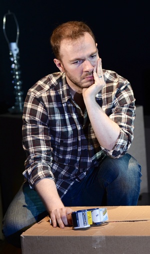 These lines from Shakespeare's Macbeth could well have been written about Kyle, the anguished central character in Toni Press-Coffman's Touch, a tender and humane play about love, loss, mourning, and a search for meaning, opening tonight in a well-acted and, yes, touching production at 59E59 Theaters. Through most of the play, first produced in 2000, Kyle (Pete McElligott) is encased in a self-protective psychological wall he has erected in order to protect himself from the crushing pain brought on by the sudden and violent death of his wife of six years, Zoe, who "went out one night and didn't come back." And while Kyle does not allow himself to feel the full brunt of the upheaval, he is willing to talk to us though the safe barrier of the "fourth wall" as he completes the task of boxing up the remains of his and Zoe's life together. It is a tribute to Kyle that, even though we never meet Zoe, he is able to conjure her up so vividly, she seems to be onstage the whole time. In a richly-detailed opening monologue, we learn how the two of them met as students in high school. Kyle was smitten at the first sight of Zoe as she waltzed into his physics class, looked around, and announced, "I am so in the wrong room!" Theirs was the classic match between the brainy, nearly-friendless nerd and the free-spirited popular girl he would marry just a couple of years later. Gradually, as Kyle fills in the details, we learn that he and Zoe did have their ups and downs in the time they were together, and we do see that while he deeply loved her, he did not worship at her feet. There is some anger and jealousy mixed in with the sorrow, and Kyle's behavior towards the play's other characters is rocky as he continues to serve the savage god of grief. He brushes off his closest friend Bennie (Amadeo Fusca) and his sister-in-law Serena (Emily Batsford), and he finds his only surcease in anonymous sex with a prostitute (warmly portrayed by Katrina Lenk). Touch, directed by Nathaniel Shaw, is at its best when it is fully focused on Kyle as a struggling and realistically complicated, not always pleasant individual. Too much is made, for instance, of his professional life as an astronomer and of the awe he feels for the great and vast unknown universe, where "science and the spirit meet." Such musings allow for the playwright to display flights of poetry, but Kyle really isn't a poet, despite his avowed fondness for Keats. He is a confused and battered human being, trying his best to get by with a little help from his loyal friends, even if none of them seems half so real (to him or to us) as Zoe. The power of the play lies in its depiction of Kyle's efforts to gain a secure foothold for himself while safely maintaining a fully intact memory of Zoe; both are in jeopardy throughout. Under Nathaniel Shaw's direction, Pete McElligott does a splendid job of bringing the devastated Kyle fully to life and gives us good cause to join him through the long, sometimes meandering journey out of darkness.