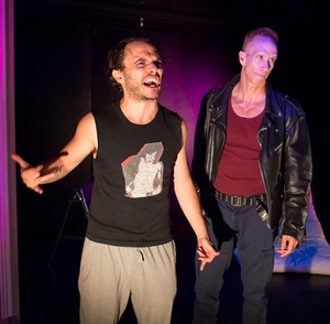 Sorely in need of a life-changing intervention, Tuffer (a charmingly manic Nic Grelli) is the anchorless scion of a wealthy family, about whom his closest friend Roderick (performed by Mr. Brantley) says: "He never had to count his blessings. There was always someone on staff for that." When we first meet them, Roderick is pounding on the graffiti-covered door of Tuffer's New York apartment. It is five in the morning, and Tuffer has called his friend in a panic over an intruder. Turns out the "intruder" is Tuffer's latest boyfriend, the much younger Brandon (Todd Flaherty), whose presence annoys Roderick nearly as much as the pre-dawn false alarm. The Jamb, directed by David Drake, asks a lot of our attention during the exposition-heavy first act, which includes, among other tangential points, a discussion about an André Gide novel. This talkiness prevents us from learning much more than the facts about the characters and their lives, focusing instead on Roderick's anger and Tuffer's resistance to change. The two go at it tooth and nail, while Brandon barely can get a word in. The playwright also strives to contextualize the story within the broader history of gay life in the United States. The play takes place in 2008, just as California was about to join Massachusetts in legalizing same-sex marriage, a hallmark of openness that Tuffer and Roderick never imagined growing up. They were born in the late 1960s, at the time of the Stonewall riots, and came of age half-in and half-out of the closet, stuck, as Tuffer puts it, in the doorjamb. By way of contrast, Brandon, who is not half so clueless as he pretends to be, is representative of the younger and freer generation of gay men who are far more comfortable in their skin (lots of which is on display as Brandon parades around in his briefs). At one point, as he prepares to walk out in disgust, he tells the pair: "You guys are pretty lame if you think turning forty is such a gigantic tragedy. I mean, you could be turning forty in Darfur. You could be turning forty in fucking Afghanistan." It's an insightful observation, but turning 40 is nevertheless a huge deal to Roderick and Tuffer. Roderick has been clean and sober for several years, and he despairs at the way his friend clings to his increasingly self-destructive behavior. The two argue relentlessly about this, until Tuffer agrees finally to go with him to attempt to dry out at the home of Roderick's mother in New Mexico. The characters become more fully realized in Act II, which is greatly enriched by the presence of Roderick's mom Abigail (the delightful Carole Monferdini), a free-spirited former folk singer and flower child. Her hippie ways annoy and embarrass Roderick, but she seems able to bring out the best in everyone. Her affirming presence, along with the New Mexico sunshine, softens Roderick and Tuffer, and we begin to see that the defiance with which they embraced the post-Stonewall "gay lifestyle" has also hardened them against the possibility of accepting genuine affection and support. It is a significant breakthrough when Tuffer pleads with his friend and possible life partner, "please don't give up on me." We may not be able to predict where they will wind up, but by play's end they are at least moving forward after being stuck for so long.