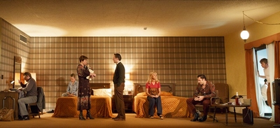 For set designer Andrew Lieberman has designed not one room of the Inn, but fiveit just so happens that all the rooms are identical and occupy the same setand Gurney has populated them with ten powerfully vivid characters that span not Gurney's usual realm of well-heeled northern families but instead the full spectrum of the American experience of the play's late-1970s setting. (And, well, pretty much the American experience at any era.) That their lives are conducted both figuratively and literally on top of each other, with successes, heartbreaks, assignations, and even dialogue overlapping constantly, but none of it ever becomes confusing, difficult to follow, or even the slightest bit mechanical is a tribute as much to the heroic efforts of director Lila Neugebauer as to Gurney's writing. And there, dear reader, is where this review becomes considerably more difficult. Because those stories unfold and expand over the full running time, The Wayside Motor Inn is the functional equivalent of ten plays in one, with far too much happening for any abbreviated synopsis to contain. You can say, and be absolutely correct, that a myriad of age ranges and classes are represented, and through their almost completely silent interplayinteractions between characters in separate rooms do occur, but such instances are rare and always temporaryreveal a country and a people at a cultural and economic turning point that closely echoes many of the discussions facing (and dividing) us today. (Though an earlier draft of the play was workshopped in the 1970s, this is its world premiere.) But such an analysis, even taking in the Biblical reference that provides its title (Matthew 13:4 or Mark 4:4, about seeds falling by the wayside and being devoured by birds), is insufficient. For the full picture, you really do need to experience first-hand the collage of traveling businessman Ray (Quincy Dunn-Baker) and older couple Frank and Jessie (Jon DeVries and Lizbeth Mackay), on a trip from far away to visit their grown childrenthe smiling, sleazy dishonesty of a man juxtaposed against two people who are lying to themselves about what they can and can't do with the remainder of their lives. Or Vince (Marc Kudisch), who's arrived with his teenage son Mark (Will Pullen), in advance of a Harvard interview Vince has used his connections to ensure Mark will ace, even though the boy wants nothing of it. Or Phil and Sally (David McElwee and Ismenia Mendes), two early-twentysomethings who are ostensibly looking for a safe place to have sex for the night, but are really trying to understand the nuances of their evolving relationship. Or Andy (Kelly AuCoin), a doctor who's in the process of divorcing his wife, Ruth (Rebecca Henderson), and is working to hang on to the threads of love and connection that remain between them. Each tale, each pairing (Ray's match, so to speak, is the truth-telling, conspiracy-minded coffee-shop waitress Sharon, played with gum-chewing brio by Jenn Lyon), adds to the work's unique texture, and is compelling (if rarely especially complex) in its own right. And the actors are superbly cast, finding the utmost intensity in their everyday interactions and making you care more about these simple people than you may have thought possible. Only Kudisch seems to be deploying garden-variety tactics in crafting Vince; he piles on the bluster a bit heavily and the emotional colorings lighter than is ideal. But watching, as but two examples of dozens, the layers of meaning couched in every one of DeVries's grimaces as Frank is wracked with pain while struggling to make it on his own, or the desperation Pullen finds in showing the many ways Mark is flailing in asserting himself and his own wishes to be an auto mechanic rather than an Ivy League Man, is truly captivating. Gurney wrote in a note in the script that he hopes that with this method of storytelling he "can make the ordinary seem somehow extraordinary, just as several simple melodies enhance each other when they are interwoven in a musical ensemble piece." That's a lofty goal that I'm not sure he entirely achieves. Conceptually it all works, and each of the ten individual plots is fully satisfying. But it never quite adds up to as much as it feels like it should, especially with a concluding scene (in which, naturally, most everyone leaves their rooms for one reason or another) that's weaker and less precise than everything that precedes it, so a greater pointbeyond painting the grand, diverse, and troubled panoply that is Americais lost just when it should most readily be found. So good is nearly everything else, however, that even that stumble is not enough to cause The Wayside Motor Inn to fall by the wayside. And as an example of acting and direction at among the highest levels New York has to offer, you'll happily devour it yourselfand still be craving more.