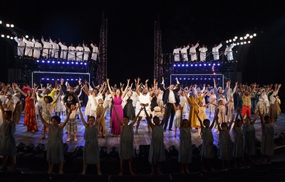 Conceiver-director Lear deBessonet and writer Todd Almond have collaborated on this spectacle for the Public Works program, which seeks to unite the performing community with the New York community, much as they did the previous two years with their similar versions of The Tempest and The Winter's Tale. Their goal is less to concoct a traditional, or for that matter even viable, musical than to kindle the involvement of city groups that will make the evening a celebration of New York arts in all its infinitely varied forms, and capture something more than a straightforward theatricalization of Homer's epic, which follows King Odysseus's sweeping journey back to his wife Penelope and son Telemachus in Ithaca after the completion of the Trojan War, ever could alone. So the goddess Athena is represented by gospel singers, The Bobby Lewis Ensemble. The Phaecians are embodied by joint-achingly nimble young men's dance troupe called The D.R.E.A.M. Ring, for whom traditional physiological notions of limb movement simply do not apply. Circe's alluring but vicious coterie is a sextet of steamy dancers from Flamenco Vivo Carlota Santana II. The spirits of the underworld are a gaggle of children from TADA! Youth Theater, and the New York Youth Symphony materializes to set the home stretch of Odysseus's trek to haunting, vocal-free music. The palace guard that signifies a last-minute obstacle for Odysseus to overcome is a wry and agile collection of musicians called The Marching Cobras. Perhaps most bizarrely, Queen Penelope's suitors are The Old Bones Motorcycle Club, specifically the N.Y.C. Fire Riders and the M.L.C. Crew. And did I mention the 90-strong "community ensemble" to round out the crowd? There's an undeniable magic in seeing the Delacorte filled to bursting with these performers, especially in such a high level of production, complete with a swirling dreamscape of set and lights by Justin Townsend; gloriously colorful and characterful costumes by Paul Carey; spirited, we're-all-in-this-together choreography by Lorin Latarro-Kopell; and Almond's lively musical direction, his five-borough cornucopia score receives the properly ebullient rendering from the four-piece band. The joy of it all is so inescapable that the drama itself, as communicated through the writing and non-pageant direction, is of little significance.