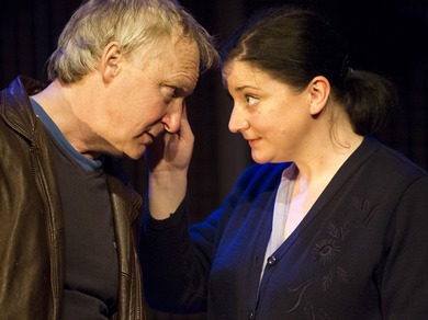 Little Thing, Big Thing begins with a bang of exposition that sets things off at a fast clip so fast, in fact, that you may just have to grab hold, pay attention, and catch up later (with both the plot and the strong Irish accents). But the little extra effort pays off handsomely as, bit by bit, the pieces fall into place, and every coincidence and happenstance becomes an essential plot element. Sister Martha has agreed to smuggle out the undeveloped film and pass it along to an acquaintance on the lam in Dublin ever since his brother went missing under suspicious circumstances back in Nigeria. The film contains incriminating evidence about a murder and the complicity of a corrupt global oil executive and a high-ranking Nigerian military officer. The nun and Larry meet up when they both hide in the same closet from an armed intruder at Sister Martha's home convent. (Larry is there to steal a statue of the Virgin Mary, "the Assumption in reverse," he calls it.). In two shakes of a tail, they have joined forces and the chase is on as the pair flees their pursuers, who are bent on destroying the film and anyone who stands in their way. In its pacing, and with its wonderful mix of suspense, eccentric comedy, and tender moments, Little Thing, Big Thing may remind you of The 39 Steps, both the Alfred Hitchcock movie and the more recent theatrical production. The roll of film is what Hitchcock would term a "MacGuffin," the plot device that serves as an excuse to set the story moving and the characters scrambling to stay ahead of their would-be killers, in this case across John Comiskey's minimalist set. As in the stage version of The 39 Steps, Mr. O'Kelly and Ms. Fox portray multiple characters 17 between them. But there is no silliness involved in the quick changes, no wigs or costumes or shadow play. The characters are simply necessary for the plot, and the actors take them on as needed, using their voices and facial expressions to keep us apprised. This is emblematic of the power of this production. Between Mr. O'Kelly's very skillful writing and his and Ms. Fox's terrific performances under Jim Culleton's direction, Little Thing, Big Thing grabs hold at the start and never lets go, a real treat for anyone who has ever been enthralled by the ability of language and impeccable acting to touch the mind and the heart. We grow quite fond of Larry and Sister Martha over the course of the evening, and we can only wish them Godspeed as they strive to fulfill their mission of justice against those who would destroy them.