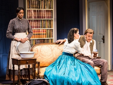 Smartly directed by Kareem Fahmy (credited, as well, as co-developer) and boasting an impeccable ensemble of actors, Couriers and Contrabands takes place in the spring of 1864, during the month leading up to the Siege of Petersburg, Virginia, along a major supply line for the Confederate army. It opens in the near dark, the audience surrounded by lightning flashes and great booms of thunder that foretell the booms of cannons to come (Mark Van Hare provides the excellent sound design as well as the original era-evocative music). Through the lightning, we can barely distinguish an African American man passing along a packet of documents to a fellow spy and receiving another packet in exchange. Later, we will come to learn that the man is Willie (Luke Forbes), who is posing as a slave in one of the two neighboring households where the action occurs. Willie is a "Contraband," a term used to describe escaped slaves or other free blacks who were working for the Union Army. An air of authenticity suffuses the play, from David Esler's set design to Sarafina Bush's period costumes to the Southern accents that the actors employ without a trace of "fiddle-de-dee" exaggeration. We fellow the machinations of a group of Confederate spies who are using one of the homes as their headquarters. On hand are the group's leader, Thomas (Michael Schantz); his sister Lottie (Heather Hollingsworth), who has managed to sweet-talk her way into the inner circle of a Union major; Thomas's close friend James (Eric T. Miller); Lottie's dear friend and neighbor Mary (Helen Cespedes), for whom Willie is a servant; and a young corporal, George (Jeremy Beck), who is there to keep an eye on things for Confederate General Beauregard, much to Thomas's annoyance, feeling he himself is being spied upon and his every action second-guessed. Ignored in the background is Lottie's housemaid Nancy (Kristel Lucas), another slave whose eyes and ears are always open for news she can pass along. The truth is, no one knows whom they can trust, and there are many surprises and revelations to come as events unfold. The marvel of Couriers and Contrabands is that the playwright has made the detailed conversations about espionage, troop movements, and the ongoing war itself so utterly compelling, and has populated the work with characters who are so richly drawn that no matter where our sympathies lie we wish for all of them to get through unscathed. We also learn a lot about this historic time period, but never feel talked down to, a remarkable feat for a work like this that deals with a very specific component of the Civil War for which most of the audience will have scant prior knowledge. The topper in all of this is the outstanding performances by every member of the cast, each of them inhabiting their roles with utter conviction. If there is a standout, it is Jeremy Beck as George, the young corporal who goes from being irritatingly full of himself, to charmingly goofy as Mary captures his heart, to later becoming a suspicious and belligerent soldier as the weeks drag on and the tensions rise. In the end, we can see that war brings out both the best and the worst in people, and how the Civil War truly did divide brother from brother, friend from friend.