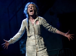 The "A" of the title stands not for "Adulterer" but for "Abortionist." The letter has been branded into the flesh just above her breast of its wearer, here named Hester like Hawthorne's protagonist. By law the "A" must be visible at all times, a mark of shame but perhaps also useful as an advertisement for the services that provide her only means of getting by. When we first encounter Hester (Christine Lahti), she is wearing a blood-covered apron. It has been a busy day, but even now, at midnight, she knows she will be seeing more customers as the night wears on. "Their troubles, yr livelihood," she says to herself as she cleans up, weary but accepting of her lot in life. Hester has but one goal for herself, to collect enough money to buy freedom for her son Boy (Brandon Victor Dixon), who has been locked away in prison for decades after being caught stealing a bit of meat as a child. Week after weary week, she reports to the Freedom Fund office to add her payment. But no matter how much she puts in, the more it seems she has to come up with. Still it is the only hope she can cling to, until even that is taken away when she is told that Boy, now redubbed "Monster," died in prison some time ago. With nothing to live for, Hester determines to take her revenge on the person who turned in her son in the first place, the Mayor's wealthy wife, First Lady (Elizabeth Stanley). The plot turns on the fact that First Lady is finally expecting a child after years of trying. It is the only way she can get her self-important, dynasty-aspiring husband (Marc Kudisch) to stay with her. That the child she is carrying isn't his is not terribly important in her worldview, not in comparison to maintaining her place at the top. As it turns out, Boy/Monster did not die in prison, but escaped. There is, however, a band of vicious Hunters (J. Cameron Barnett, Ben Horner, and Ruibo Qian) at his heels. They intend to torture and eviscerate him once they catch him. And in this society, there is no doubt they will catch him. Ultimately, the various plot threads come together. Hester gets her revenge, but she must pay a heavy price in doing so. The play unfolds with the inevitably of a Greek myth, with a low-key style of performance that would seem to be intentional on the part of director Jo Bonney. It is the kind of distancing effect that Brecht was partial to, forcing us to think about the big issues without allowing us to get pulled into the particulars of character or plot. Whatever emotional connection we feel is the result of what we bring to the table ourselves. As a consequence, and after so much set-up, the act of revenge is rather anti-climactic. There is no catharsis for Hester or for us. Even as she triumphs, nothing has really changed. Instead, we leave her getting ready to answer the bell for her next customer. The tone of weary resignation is mitigated somewhat by the inclusion of two other characters: Hester's friend, the mayor's mistress Canary Mary (Joaquina Kalukango); and Butcher (Raphael Nash Thompson), who woos Hester in a surprisingly sweet scene in which they are wearing matching blood-stained aprons. The playwright herself has also written several Brecht-like songs that the cast members perform over the course of the evening by way of running commentary. A final creative touch comes with the occasional use of a separate language, an argot that is the exclusive domain of the women, which they use for discussing things of a sexual nature (we are helpfully provided with simultaneous projected translations). Fucking A is one of two plays Parks wrote around the same time, the other being In the Blood. Both are riffs on Hawthorne's novel, and both are being presented under the umbrella title, The Red Letter Plays. In the Blood opens in a few days, and the pair will then run simultaneously in separate theaters at the Signature Center.
