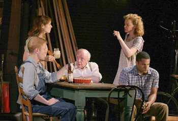 Thurber's previous plays in New York, which have included Killers and Other Family, Where We're Born, Stay, and Scarcity (which was produced at the larger Atlantic theater in 2007), reflected the playwright's willingness to go shadowy if she had to. Her works often focus on friends and family who aren't exactly what they appear, but are nonetheless a vibrant (if sometimes unwanted) part of life. This play, dealing as it does with selves we aren't but wish we could be and sisters that no longer are but we wish still were, would seem to be in line with what Thurber's done before. But through the imaginary or deceptive elements of her other plays, Thurber tapped into deeper and more compelling visions of humanity and narrative than she does here. Director Caitriona McLaughlin's production is handsome, but the script is so unassuming you're never convinced it needs to play so many existential mind games. Or, for that matter, that despite its underlying message about returning to an active life after an emotional upheaval, it has any identifiable need to exist in the first place. Not that pointlessness is necessarily undesirable in and of itself. A mood or charm piece along these lines could be perfectly acceptable, even heartwarming: Abigail (Crystal A. Dickinson) is still forlorn following the death of her novelist sister, Kate, and turns to her mental invocation of her sister (played by Jessica Love) and her final blockbuster book as a way to cope with her grief. The book explores what it might be like if the present-day sisters, who have fathers of different races (and look it), had been born men a half dozen or so decades earlier, and soon those brothers, Josh and Ely (Brendan Griffin and Brandon J. Dirden) become an unavoidable part of Abigail's world. Likewise, the juxtaposition of relationships should also provoke, depicting as it does both Abigail's unwillingness to properly return the affections of the new woman she's seeing (K.K. Moggie) and Josh's trouble adjusting to married life with Dana (Aubrey Dollar), who's not so secretly in love with Ely. Add in the additional layer of Abigail's friend Susan (Dollar again) faced with the separation and divorce of her own parents (Peter Maloney and Kristin Griffith), and you have all the ingredients for what should be a fine and fulfilling recipe. Except, that is, for the salt, which has been forgotten entirely. The intertwining of the past and the present, the straight and the gay, and the young and the old all seem more obligatory than essential: never wrong, but also never wholly right. Thurber and McLaughlin have both done an outstanding job at differentiating between the various colliding realities, but never build up to anything that makes it all seem worth the trouble. Perhaps Abigail has changed some by play's end, as she comes to understand Kate's writing in a way she never could when she was alive, but the play stops well short of suggesting that similar change is possible - or not - for you in the real world. If that's not the goal, there's no clue given to what is - and that aimlessness becomes its own problem, even over the course of 90 never-unpleasant minutes. That the characters tend to speak in clipped, poetic shorthand doesn't help. At times it seems Thurber is paying tribute (if in a folksier way) to the Edward Albee of the just-opened Me, Myself & I, imparting that play's sense of "excess by less" and the lack of any particular locomotion. Some much-needed energy is derived from Walt Spangler's set, which smashes together a modern apartment with a makeshift plywood oak tree that consumes the past and threatens the present as well, and the evocative rustic music (by Tim Lawrence, Robert Kaplowitz, and onstage fiddler Alexander Sovronsky and banjo-mandolin player Bennett Sullivan). For that matter, the performances too engage, with Dickinson a movingly tortured presence, Love a smart a shining beacon of memory, and Griffin and Dollar and Maloney and Griffith making spirited couples who are ideally poised and positioned to drive the action. Unfortunately, it never starts up - at least in any significant way. Bottom of the World seems much like Kate: endless potential that's never allowed to reach its fullest, completed form, and leaves behind a collection of impressions that show it at its best but still somewhat less than outstanding. Whether the play is suffering from a shortage of darkness or light may be open for debate, but you never feel certain that Thurber knows which lamps should be off or on.