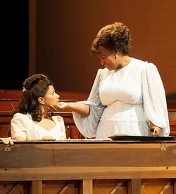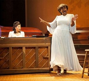 Most important, it's a jumping-off place for what becomes a more sobering exploration of what success means, for those two particular women in their particular era and for all of us in ours. Fearless though these two may be when performing, they have their own secrets and stumbling blocks that are preventing them from becoming everything they're capable of, and when they tackle these issues directlywith the insight only the other can dispensewe see that there's a lot more to who they were and what they did than their rollicking, spiritual entertainment. Each number (and that's not an exaggeration) is not only a showstopper for the force it bears but also for the emotions and the history behind it that ultimately say a lot more than you might be expecting. No, Marie and Rosetta is not especially deep or original in its thinking or presentation. What matters, however, is that it's exquisitely crafted, from the design (Riccardo Hernández did the surprisingly witty set, Dede M. Ayite the class-defining costumes, Christopher Akerlind the alternately brash and poignant lighting) to the direction to the portrayals. It's tough to imagine we'll see better musical performances this season than Lewis and Jones do here. They work brilliantly together, effortlessly contrasting each other in physical appearance as well as mien and voice ("Rock Me," when Jones, adopting her most timidity and stiffest spine, takes on Lewis blaring out her soul at maximum trumpet, is perhaps the best illustration, but far from the only one). But they have intricately articulated each woman as an individual, too, so that we're forced to see them as genuine people facing multiple layers of difficult circumstances and not merely the icons they've become over the last 70 years. The more Brant strips away from them, the more intimate and, strangely, more expansive Marie and Rosetta becomes, until we can no longer see the women's fame but instead only the aching humanity underneath. Once again, the lesson that being true to yourself is only way to find real salvation, is not new. But it doesn't need to be when it's executed this well. Besides, there's a bigger problem: How can the Atlantic afford repairs eight times a week when Lewis, Jones, Brant, and Pepe keep blowing off the roof by giving us everything they got?