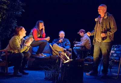 Even the most original section, Act II, when the survivors also stage TV commercials and pop-music medleys (the appropriately derivative MTV choreography is by Sam Pinkleton), struggles to stay uprightthere are a few too many discussions about the amount of Diet Coke remaining, or whether Chablis or Shiraz is the better wine. Because Washburn conceived Mr. Burns with director Steve Cosson, he's powerless to help things in his staging: Someone further from the material, who could close the gaps and impose tolerable pacing, would help tremendously. The actors are similarly trapped, and though I can't say I was consciously aware of them giving performances (which in this case should not be considered a compliment) I'm also not sure I was supposed to. For the first two acts, everyone responds to his or her first name: Matthew Maher is Matt, Jennifer R. Morris is Jenny, Susannah Flood is Susannah, and so on (through Sam Breslin Wright, Colleen Werthmann, Gibson Frazier, Quincy Tyler Bernstine, and, in the third act only, Nedra McClyde). Is this to reinforce the here-and-now nature of what's happening? Maybe. Is it daring? No. It actually gives everyone yet another excuse to avoid distance, and comes across as more than a little pretentious. On that score, nothingbut nothingtops Act III. As with everything else here, it's uncommonly intelligent at its core but unbearable in its presentation, fusing Neil Patel's apocalypse-cartoony set, Emily Rebholz's costumes, Justin Townsend's lights, and the music of Michael Friedman (of The Civilians, which originally commissioned this piece, and Bloody Bloody Andrew Jackson and the recent musical of Love's Labour's Lost) into an in-your-face explication of how we make stories our own. Saying anything about it would constitute a spoiler, but the safest explanation is that it operatically blends fiction and fact into a simultaneous evocation and explanation of the world in which the performers are then living. Melodramatic conceits, Greek tragedy, archetypal characters, and rampant ravaging of public domain all play crucial roles. If it's pretty backward-looking, it should at least be scintillating. Alas, it's much closer to stultifying, ten times longer than it needs to be, and so obviously written and grating to hear (McClyde occasionally sounds like a trained singer; the others, in true Civilians fashion, don't) that its elemental point, about how fantasy and reality intertwine over time to fashion works that are more than the sum of their arts, is fundamentally impossible to absorb. Because that last scene is thematically the key to everything, Mr. Burns: A Post-Electric Play can ultimately never be enlighteninginstead, it leaves you stumbling around in the dark, wondering how such an ex-x-xcellent premise could wind up more wrong-headed than a three-eyed fish.