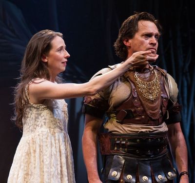 Euripides's final play is typically a surging, moving testament to the theatre he helped, well, create, exploring combating notions of duty, honor, and family at the outset of the Trojan War. Agamemnon's fleet of ships is stranded in Aulis without wind, the victims of offending the goddess Artemis, and they'll only be able to set sail if the Greek hero sacrifices his daughter to the deity, in fierce spiritual rejection of his wife Clytemnestra (an act that would have major repercussions much later). A warrior's anguish! A mother's rage! A daughter's selflessness and suppliance! There's even something of a romantic triangle, once Achilles and his battle for his bride-to-be is figured in. Typical of Greek drama, there are the searing speeches, soaring feelings, and a dazzling ending to be narrated by a spellbound attendant. What there is above all, however, is size: the sense that all of this matters from these earthly docks straight up to the apex of Mt. Olympus and that man and gods are forever entwined in a struggle for their very existence. With her transadaptation (her term), Washburn does seem to understand this. There's a certain poetry in her writing that echoes with occasion, particularly in the doomed Iphigenia: "If I had the powers of Orpheus and my song / could magic stones to move and move men however / I pleased I would only open my lips and sing." And if her lyrics, for both the girl and the chorus, tend to have an overly "pop" feel ("Let Trojan hearts shatter / Let the Greek army sow / A righteous revenge / Yes, let the wind blow") they generally support her goal, as stated in the program, of bridging the gap between then and now. Director Rachel Chavkin's work, on the other hand, does not. Chavkin has cooked away most of the nutrients and savor from Washburn's saga and left nothing but a muddled, watery broth. On a bland, military-outpost set by Arnulfo Maldonado that's been indifferently lit by Austin R. Smith, Chavkin lets loose the action without either containing it or channeling it in ways that might bring out the latent urgency. Actors mill about distractedly, substitute indicative gestures for personality (the most frequently used is a Hitler-heiling hand motion signaling "I'm going to tell you what happened offstage"), and appear to be waiting for the fog on some unseen moors to clear before... well, who knows. Then there's the seven-member chorus, which is ostensibly of Greek women helplessly observing the stinging action around them, but is constituted in part by men in drag for no discernible reason. (This is at Washburn's request, though her edicts in the script mention nothing of the overacting male performers employed here). Their costumes (by Normandy Sherwood) are splashed with a blinding palette of colors, and resemble a cross between African and Caribbean fashions, while the songs they sing (by Shaun and Abigail Nessen Bengson, who wander among the "women" playing instruments) combine modern references and sounds into an uneasy mélange that only further separates the underlying drama from anything resembling common sense. Sonya Tayeh's choreography for them is sometimes jazzy and sometimes tribal, and thus not prone to consistency. It fits in then, if uneasily, with the jumble of influences of Chavkin's conception, which ranges from children's theatre to Japanese bunraku, and fails to make an impression even in the rare instances it does make sense (most notably, the touching final stage picture of a young Orestes sailing into history). The overall effect is one of her searching for a way to get a spate of disparate elements to cohere, even though they've never had much trouble in any other production I've seen. As for the actors, there are three who play the six lead roles, seldom convincingly. Rob Campbell finds a smidgen of authority but mostly a dazed attitude as Agamemnon, drastically overplaying his role as a pawn of more powerful forces, but his Agamemnon is even worse. Puffed of chest, stick-straight of arm, and bleating out a broad Brooklyn accent and (so help me) chewing gum, he's not a man you can take seriously, which subverts all the tension his presence is supposed to generate. The women are marginally better. Amber Gray unleashes a hollowed-out fierceness as Clytemnestra, though the barely suppressed grin on her face while playing Agamemnon's brother, Menelaus, hints that even she's not sure she's pulling it off. And as Iphigenia, Kristen Sieh scores the 90-minute evening's single unquestionable win with the climactic speech about the young girl accepting eternal remembrance in exchange for her life, revealing the kind of sprawling scope everyone onstage should have all the time; too bad her other turns, as the various messengers, are cringe-inducing in their surface-level falsity. As with everything here, I've no doubt this was intentional: Chavkin trying to illustrate through overstatement how ridiculous those hoary theatrical devices look today, perhaps? But to what end? She never gets as far as payoffs, with the messengers or anything else, choosing instead to leave the questions hanging in time much like the myriad ideas she floats and abandons over the course of the play. It's because of this that this Iphigenia in Aulis, despite its storied history, has much more trouble getting anywhere than does the Greek fleet.