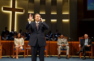 To say more would be to spoil the bevy of surprises Hnath has devised, which result in an edge-of-your-seat treatment about the way we all approach belief in any of life's biggest dilemmas. Across 100 well-greased minutes, Hnath forces us to confront how far we're willing to go for what matters to us, and what sacrifices we're prepared to make in order to defend our ideas and ideals. That he manages it entirely without villainsPaul, Joshua, and Jenny, as well as Paul's wife Elizabeth and a church elder named Jay, are all thoroughly layered characters who give us plenty of reasons to either take their sides or abandon themand without denigrating powerful belief systems of any sortis an accomplishment that pushes The Christians straight to textual success. As a play in performance, however, the seams are not invisible. Though its implications stretch well beyond just those of present-day, commercial Christianity, the depth of discussion about topics related to it may put off theatregoers who aren't well versed or interested in it. The ending is also unsatisfyingly abrupt, as if Hnath wanted to leave things open-ended but didn't care whether he did so neatly. And the entire thing is filtered through the rocky concept of treating every line of dialogue as though it were a sermon or part of a high-tech passion play. The characters speak nearly exclusively into microphones cranked to ear-thumpingly high (and occasionally muffled) volume, and there are no other transitions between scenes; everything occurs as if on the rostrum of this church, and figuring out what parts of the action are public and which are private becomes a full-time activity. True, perhaps director Les Waters could have staged these sections better. But his staging throughout is otherwise solid, and under his guidance the actors are brimming with affecting understatement; and Hnath never justifies it in the script anyway, leaving it to play as an unnecessary gimmick rather than the pointed Brechtian homage it feels it was it was intended to be. This doesn't sink the evening, but it doesn't help. Superlative performances compensate for a lot here, beginning with Andrew Garman. He's wonderful at investing Paul with a rock-ribbed certitude that is at once embracing and off-putting, and contorts itself into fascinating new shapes and colors as the structural limitations and defects (and their impact on others) of his new approach become increasingly clear. Larry Powell is likewise serenely powerful as Joshua, showing us a man who, in absolute accordance with Hnath's crafting of the man as someone religion rescued from the streets, is forever at odds with his own better and worse natures. As Elizabeth, Linda Powell brings an arresting sophistication to a woman who becomes an unsung victim of her husband's spiritual largesse. The roles of Jenny and Jay are much smaller (essentially a scene each), but in essaying them Emily Donahoe and Philip Kerr hit with maximum force. So, too, does The Christians overall, despite its presentational stumbles. Hnath hones in, with quick and accurate devastation, on the kinds of fears and misgivings that define turning oneself over completely to anything or anyone, and that leave us less sure than when we started. "I believe what I believe because I know it is true," Paul testifies to himself at one point, "but why do I know it's true? It's a feeling. And where did that feeling come from?" He concludes it's God, but you sense that Hnath acknowledges that's but one answer of many drifting within a universe of infinite questions. While he's exploring them with the reverent richness he does at his best here, there's no place you'd rather be than right by his side.