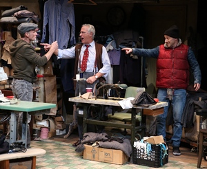 The play centers on a get-rich scheme hatched by a petty crook named Bobby (Peter Bradbury) and his mentally challenged younger brother Terry (Kevin Isola). After a rambling introduction, the story gets going when Terry shows up with a violin he found in the back seat of the cab he was driving during one of his short-lived jobs. Terry has abandoned the job and the cab, but he has decided he will keep the violin, teach himself to play it, and pick up some money performing "at Carnegie Hall, or maybe even in the subway tunnels." When Bobby discovers that the violin is a $4 million Stradivarius, he comes up with a half-baked plan to extort a hefty award from the owner in order to pay for his dream of "beaches and palm trees" for the siblings. All of this takes place under the watchful eye of Gio (Robert LuPone), an aging tailor in whose shop the play takes place. (The grandly cluttered and ground-in grime of a set comes thanks to designer Harry Feiner). Gio's shop is a second home to Bobby and Terry. Although the brothers are both middle-aged, they have relied on Gio to be their surrogate father for many years, especially after their parents "went off to heaven together," as Terry puts it. Gio has always followed the straight-and-narrow path, but his life has been one of tedium and disappointment, enough so that he half-heartedly agrees to go along with the plan. The rest of the play unfolds amidst side stories that lead nowhere, quarrels, expressions of love and gratitude, and a last-minute confession to justify a sacrifice worthy of a Bette Davis weepie. Somewhere buried in all of this is a lost potential to focus more directly on Gio, who is the living embodiment of regret, loneliness, and remorse. What little we learn of him suggests he should be at the center, and not the brothers, whose behavior is not convincing despite the best efforts of the actors to bring them to life. These are grown men (as their characters are meant to be) acting like adolescents with poor decision-making skills, as if they were escapees from This Is Our Youth who have aged in years but not in experience. The three performers, under Joseph Discher's direction, do their best with what they have been given to work with, but there simply is not enough for The Violin to escape its discordant structure.