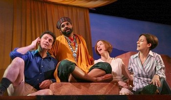 While on a quest for self-improvement and nirvana with their British friend Lydia (Kathleen McNenny), affluent married couple Mavis (Judith Lightfoot Clarke) and Travis (Stephen Schnetzer) discover that there's a high price to be paid to be rich in spirit. They are taught this lesson by Guru (a wily Kenneth Maharaj), a local and famous wise man that frequents a grandiose religious ruin to dispense knowledge and indirect instruction as he pleases. When they arrive at his "office" with only one hour to spare, they find that he takes customers in the same manner that the Department of Motor Vehicles does: by ticket number. So begins the tomfoolery that is at the heart of this production, and that is seemingly behind Guru's (or swami, as Travis derisively calls him) plans. And by the end of his circus, they may not acquire what they came for, but they leave with exactly what they need. Three Travelers aims to bring levity to a theme that is typically weighty. Rather than beat back the evils of human nature, it offers instead the option of exposing them for what they are and dealing with them rationally. It reduces wisdom and truth to party tricks, and in so doing, somehow makes attaining freedom accessible to everyone. Unfortunately, the script by Abrons is cheeky and clichéd and wise words from various religions and philosophies are dealt out in the same manner that a croupier would deal out cards at a casino: flippant, random, and all shuffled together. Although the relationships of the tourists are integral to the plot, their true natures unravel predictably and much in the same manner as a soap opera (no pun on Schnetzer's elaborate soap opera career intended). Although the set design by Don Llewellyn is extravagant and striking, it does not represent the "ruin" that it should. This broken down palace is much grander than it should be and is the antithesis of a guru's typical meager environment, specifically since like many gurus, the guru of this play often references a simple life and freedom from possession as the guidelines for happiness. Although the set does create the illusion of Guru's lofty knowledge, it is not supportive of the remaining cast. Under Jay Broad's direction, the actors already struggle to keep things animated. Against the giant broken pillars and mortar, the slow moments between them are enhanced. The set simply upstages the cast. As the truth serum, Maharaj is playful and successful in drawing out desires, but his bait is not tempting enough for us to believe that the confessions of the actors would be the inevitable result. Tensions escalate in ridiculous proportions, with an even more outlandish climax to rope everything together. Three Travelers may try to entertain and even soothe, but it falls short on both endeavors. You may let out a chuckle or two, but you won't find a rip-roaring good time here. Unless, of course, you find inflated silliness exciting. And if you're looking for guidance, you're better off consulting your local fortune-cookie purveyor.