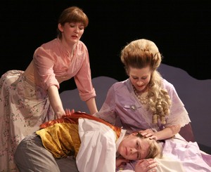 The show opens with a band of entertaining musicians dressed in David Withrow's colorful, peasant costumes. Together with Jack Blacketer's cardboard mountains and trellises, the visuals appeal to the audience's sense of fancy, but doesn't deliver on its fruition. Susanna (Gillian Wiggin), the Countess' maid and Figaro's bride to be, saunters in with a bustle that is ill-fitting and much more severe than her mistress'. One almost begins to wonder why Count Almaviva (Ralph Petrarca) is lusting after Susanna when his wife, due to rank and the fit of her costume, is made up much more impressively. But lust he does, and he makes his intentions known to Susanna. In turn, she tells Figaro (Teddy Alvaro), the Count's valet, and the Countess (Amy Ludwigsen), and together they devise a plan to expose his lecherous ways. Fast-forward through the Count's humiliation to Figaro and Susanna's marriage. After all it took to get them to the altar, married life is not as blissful as they had imagined. The second half of the show has both couples fleeing the French Revolution by foot through the woods until they're caught by border guards. By this time, nobles are being executed, peasants are revolting, and everyone, including the Count and Countess, is running out of money. In an effort to survive, Figaro and Susanna leave their former employers to settle in Haggleburg, where they run a salon and try hard to climb the social ladder. Unfortunately, Figaro is regarded as nothing but an immigrant and a gypsy, and Susanna, after years of yearning for a child and watching her husband turn into a dispassionate conformist, wants to end their marriage. Figaro/Figaro combines a comical study of aristocrats, questions about public affairs, the changing role of women and a look at relationships between men and women to create a show that is ambitious, but flawed. In general, the performances are often staccato, with emotions progressing choppily from one to the next. However, as the Count, Petrarca is more wily and humorous than anyone else, thanks to Erin Smiley's good direction. Kathryn Elisabet Lawson plays Cherubino, the Count's page and the Countess' godson, but this non-traditional casting choice isn't qualified even if it minimizes the cast. The show alternates between being droll and boring, and at 2 hours and 45 minutes, sometimes fails to keep the audience invested. Certain staging choices also require the audience to suspend disbelief without necessity. Jim Kaufman's lighting isn't dim enough to cause the confusion that erupts in a pivotal moment where the Count mistakes the Countess for Susanna. That, coupled with the bad wigs that are donned by both women, make the switch unbelievable and unfunny. A few adjustments to both elements could have improved the circumstances. Another area that needs improvement is the sound design. A sequence in which Figaro gives orphans the license to break windows is executed with mediocrity when the breaking windows sound like anything but. There are a few nice surprises in the latter part of the show. For one, the costumes improve greatly from the late 18th century to the 1930s. Ironically, the musicians, who later double as the border guards and therefore have more than whimsical musical interludes to contribute, wear beautiful purple costumes to reflect royalty when there is a lack thereof. Susanna's costumes are also drastically improved, with an assortment of beautiful dresses at a time when her lot has worsened. The update to the wardrobe may leave you scratching your head, but the visuals are immensely appealing. Figaro/Figaro may sacrifice several characters and subplots from the original texts, but it still provides a comprehensive look at the whole story. And the set changes are as smooth and quick as they are frequent. The show may not be perfectly clean, but the stains here aren't solvent-proof, either.