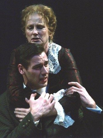 Mrs. Alving (Joanne Camp) has just built an orphanage in her late husband's memory. Pastor Manders (Tom Galantich), an old friend and advisor to the Alving family, will deliver the dedication speech. His relationship to Mrs. Alving throughout her marriage has always been one full of reprimand for her, and pardon for her husband, a wealthy man with a great reputation. Mrs. Alving reveals to Pastor Manders that her marriage was a sham upheld by the need to be obedient by the rules of Victorian morality. Her husband constantly cheated on her, and rather than save herself from the pain, she stayed behind to endure it as there was no other alternative. She elected to save her son Osvald (John Behimann) instead, sending him off to boarding school to strip him of his father's "dissolute" influence. But she could not save him from his father's sins. The result of one of Captain Alving's many sins is Regina Engstrand (Keiana Richard), his illegitimate daughter from a former affair with a house servant. Instead of exposing her husband, Mrs. Alving takes Regina in as her maid. Engstrand (TJ Edwards), the man who married Regina's mother and raised her as his own, looms nearby to never let Regina forget about her true roots and to seize the opportunity to use the truth to his advantage. Ghosts doesn't come alive until Osvald gets home for his cherished father's memorial. The first half hour creeps by unremarkably, lacking momentum and the power to engage. Harry Feiner's set of grays and blues is beautiful and reflective of the downcast atmosphere of the house and the circumstances, but the opening sequences between Regina and Engstrand are inadvertently dull. Richard is painfully out of her league with the rest of the cast, and the fact that this is her premier performance with The Pearl Theatre Company shows. Although an opportunist like her father (but to a milder degree, and by dna, not by circumstance), Edwards runs rings around her in the scenes that they share because she has yet to fully grasp that. He's quite the pimp, but she's not yet a prostitute. Also, the lack of projection of her voice is magnified by his presence. Galantich is just wily and self-righteous enough to entertain you, but not revile you. Behimann, given to histrionics, sometimes overacts, but you'll appreciate these eruptions of emotion to cut through the dryness of the production. I acknowledge that dryness is the very climate under which this story lives and is true to the script, but the lack of sound effects not only hushes the audience's excitement about the performance, it also invalidates the dialogue. Rain, both visual and auditory, is sorely missed from the production but frequently mentioned in the dialogue. However, sticking to the script and era is not always boring. As Mrs. Alving, Camp is a marvel, carrying about with a wonderful restraint in her poise, regard, and the inflections of her tone. Under Regge Life's direction, Camp embodies decorum and Victorian inhibition. This is not an easy task given the flights of anger and passion that are happening around her and indirectly, because of her. In this production, she proves why she has had such a long-standing relationship (this is her 50th production) with the Pearl Theatre Company. She is infinitely watchable, and they are lucky to have her. This Ghosts is a good rendition of Ibsen's play, but it needs more drive. The pursuit of happiness as an immoral agenda is well represented here, and Ibsen lobs a lot of sarcasm at that notion in this piece. Although today's theatre is riddled with anti-religious sentiments and trumps the pursuit of freedom as a virtue, Ghosts created quite a scandal during Ibsen's day for championing those same sentiments. Of course, Ibsen wrote it with a desire to cause sensation. Not only was it unheard of to reject society's standards, but it was especially revolutionary to discuss a venereal disease, congenital syphilis, in a drama. Granted, syphilis is never named in Ghosts, only implied. Mrs. Alving's decision to shield her son from his father's proclivities proved to be more detrimental than helpful. Thus, the virtue of sacrifice not only proves to be evil, but it is also negated here. Whether you agree with Ibsen's ideas or not is irrelevant. But he certainly made a case for them, however extreme in Ghosts. Now it's up to the Pearl Theatre Company to keep us engrossed from beginning to end.