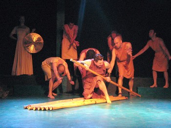 Homer's Odyssey has enough intrigue, impossible circumstances, and long-suffering characters to appeal to adults. Odysseus, a war hero with cunning intelligence, leaves his infant son Telemachus and devoted wife Penelope (Elizabeth Ruelas) to fight a war that lasts for ten years. He spends the next ten as the ping-pong ball between gods who want what's best for him - goddess of war, Athena (Jane Pejtersen) and the mightiest god of all, her father, Zeus (John Michalski) - and gods who want what's best for themselves - the often mentioned but never present god of the seas, Poseidon, and Circe, a minor goddess of magic. But it also has enchanted lands - Aeaea, the island where Circe turns men into pigs - giant, one-eyed monsters like Cyclops, and the sacred cattle of Helios, god of the sun to delight children. In fact, all of the adventures from the fall of Troy to Odysseus' reunion with his family are all wonderful material to stir up the imagination of the kiddies. Luckily, a lot of the wonder is translated onstage. The power and royalty of the gods is established from the opening sequences of this three-hour drama. Athena soars through the sky as she is carried in vertically by the strong arms of slaves who then give her their backs to descend as stairs. Despite Pejtersen's tentative steps on them, she proceeds to be the hearty princess of Mount Olympus, even if she doesn't present herself with the same commanding mettle as Michalski. Candida K. Nichols' costumes also go a long way towards conveying the splendor of some of the characters. Using creativity and well-placed accessories, she finds ways to make yards of cloth look regal. The visuals continue to entertain with Tijana Bjelajac's scenic design. Two low tables that resemble traditional Japanese furniture change from a bed to a platform by configuration. A bamboo pole is Zeus' mighty staff in one scene, joins others as a spear in J. Allen Suddeth's exciting, but short-lived fight choreography, and then returns to its natural form as a wooden plank in Odysseus' storm-wracked boat. Although the image of Cyclops works better when he is hidden behind a sheet, Marta Mozelle MacRostie's puppet is appropriate because it looks like a child's rendering of the character. The same goes for Helios' lumbering, golden-eyed cow. A child's perspective is exactly what you need to appreciate them. If you're having trouble getting excited about the puppets, Rachael McOwen has enough starry-eyed enthusiasm as Nausicaa for you to borrow. As the young princess who discovers a shipwrecked Odysseus, McOwen punctuates every word with a bubbly tone that isn't doltish in the least. She is equally impressive when she sings as a Siren and Phemios, introducing a nice balance of music versus narrative to the play. For the most part, there's a nice balance to the performances as well. Under J. Scott Reynolds' sharp direction, Handcart Ensemble's cast of eleven weave in and out of 30 characters. Although the transition from one to the next is not always clear-voices don't always modulate and appearances don't change drastically to distinguish one from the other - the gods are godly, the servants exude servitude, the sailors sail, and Penelope's suitors are as unsuitable as they come. Much like Helios' cattle, Reynolds also grabs the constant activity and imagery by the horns for a smooth and well-executed production. Despite several flubbed lines of dialogue, D'Agostini manages to wear the part of a hero as well as he wears his tunic. After all, D'Agostini needs to sell himself as an exceptional man if we're to believe that Penelope pines over him for twenty years, and that for much of those years, he's detained as a bedmate by a nymph and a goddess. With all its plot twists, turns and flashbacks, Homer's Odyssey does have the potential to be confusing. However, Armitage's version, infused with his own poetry, is coherent while staying true to the original concept. Because, as Zeus says, "no hero ever goes quietly into old age", myths will continue to be told and retold. Fortunately for its patrons, Armitage's reworking of this one is glorious in this age.